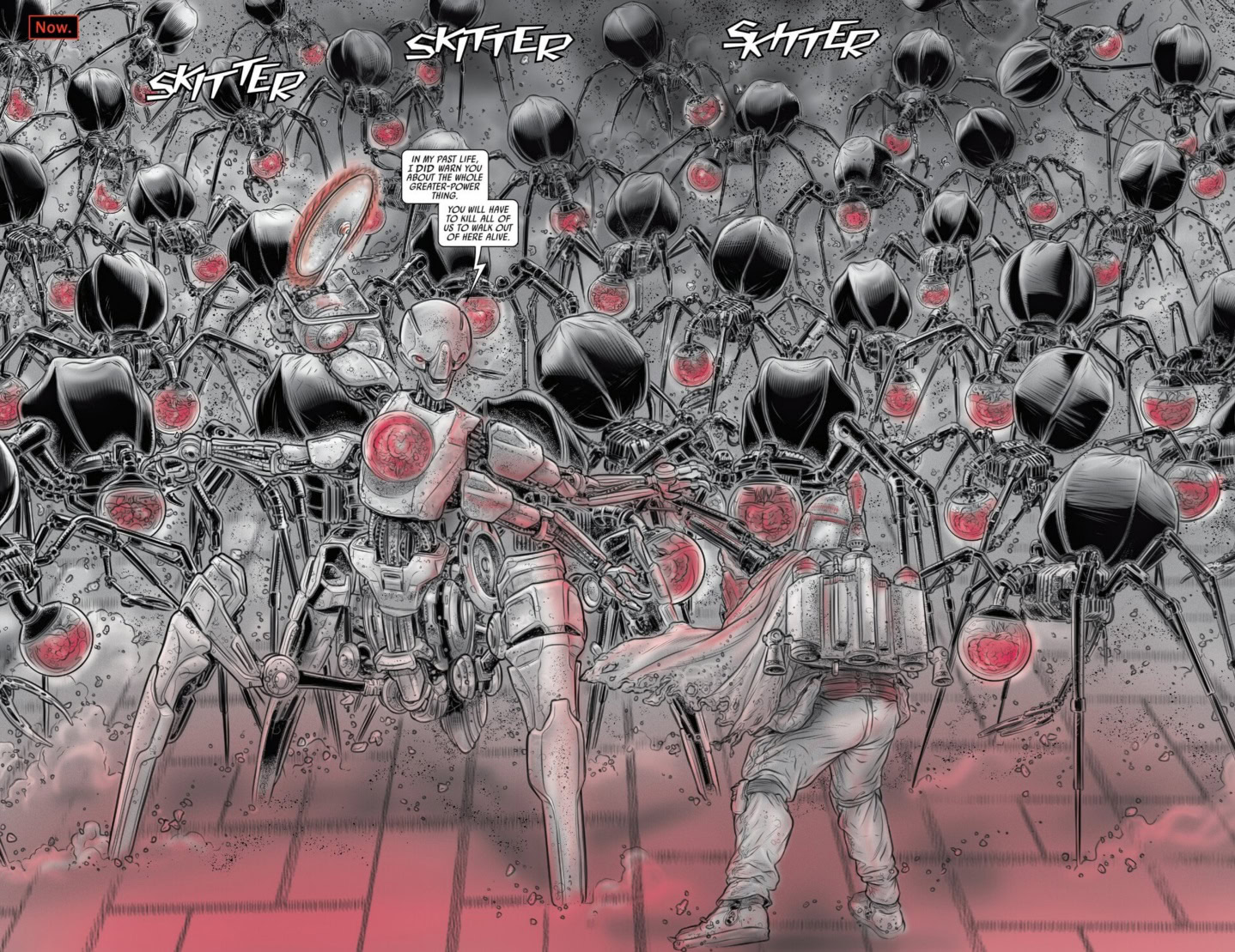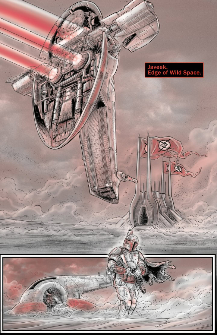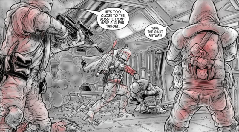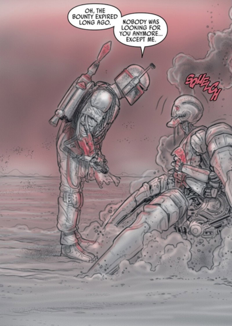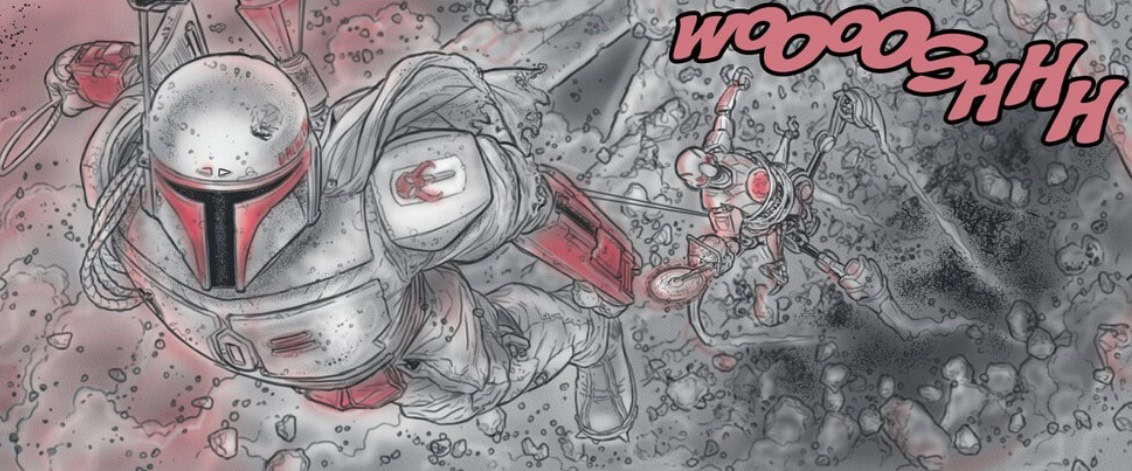 This issue is basically Boba Fett flexing how badass he is. Flamethrowers, dirty kicks, headshots, explosions, and even the Slave I in action. This issue has everything you’d ask from Jango Fett’s heir.