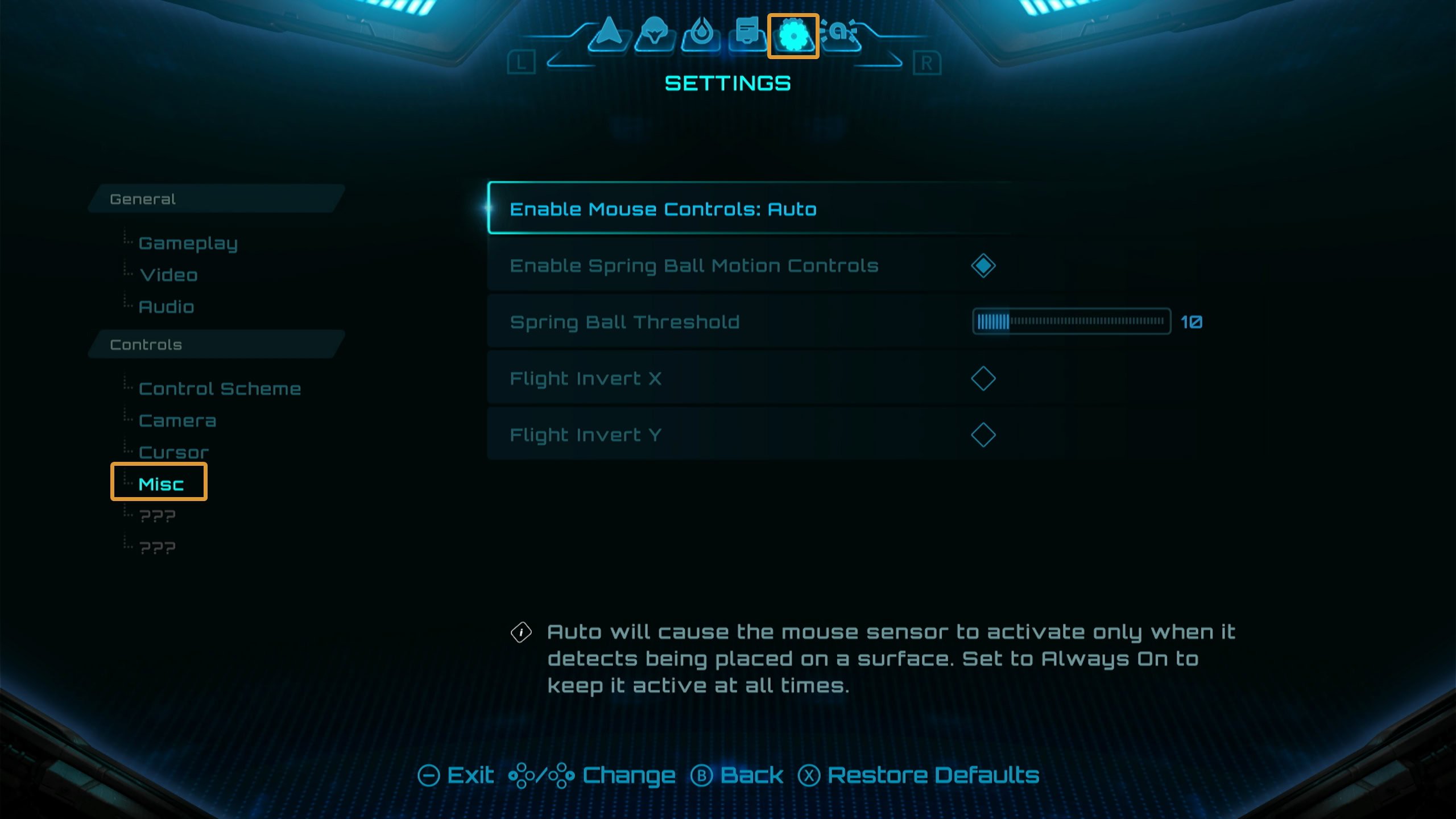 Use L or R to swap tabs and select the Settings tab as seen by the Gear Symbol. Look for Controls and select which setting you want to change. You can modify your Control Scheme, Camera Settings, Cursor Settings, and Misc.