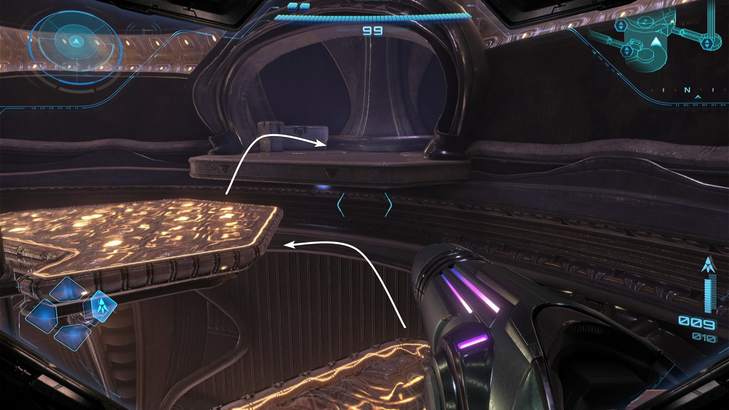 Take the east door to the elevator and descend. Jump down the platforms to reach the bottom of the Irradiation Floor and you’ll find yourself stuck. Stand on the inactive platform closest to the ledge near the door and use the Control Beam to direct a shot to the Backup Power Socket.