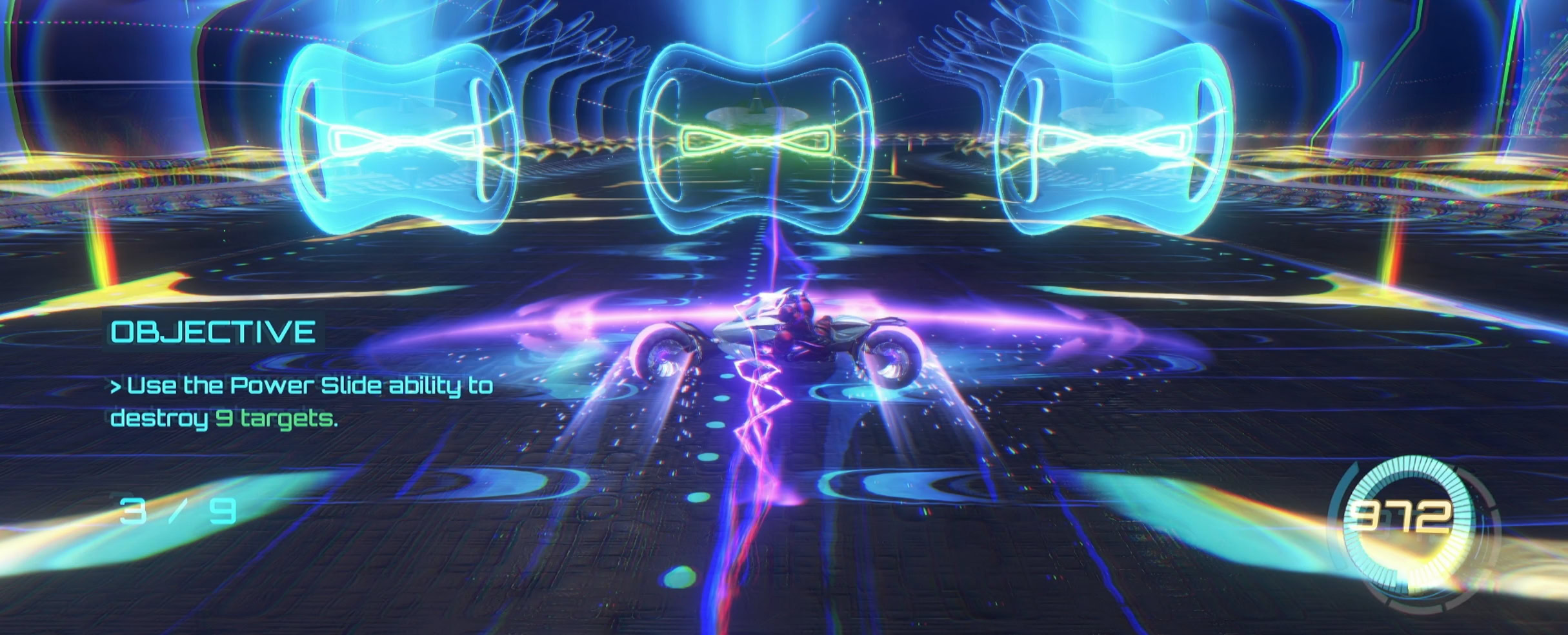 Instead, activate the console with the purple hologram to gain entry to the Test Circuit. It’s time to wind down with some fun Vi-O-La tutorials! Ride your bike into the newly opened entrance and rev up in the elevator to reach the first Test Circuit.
