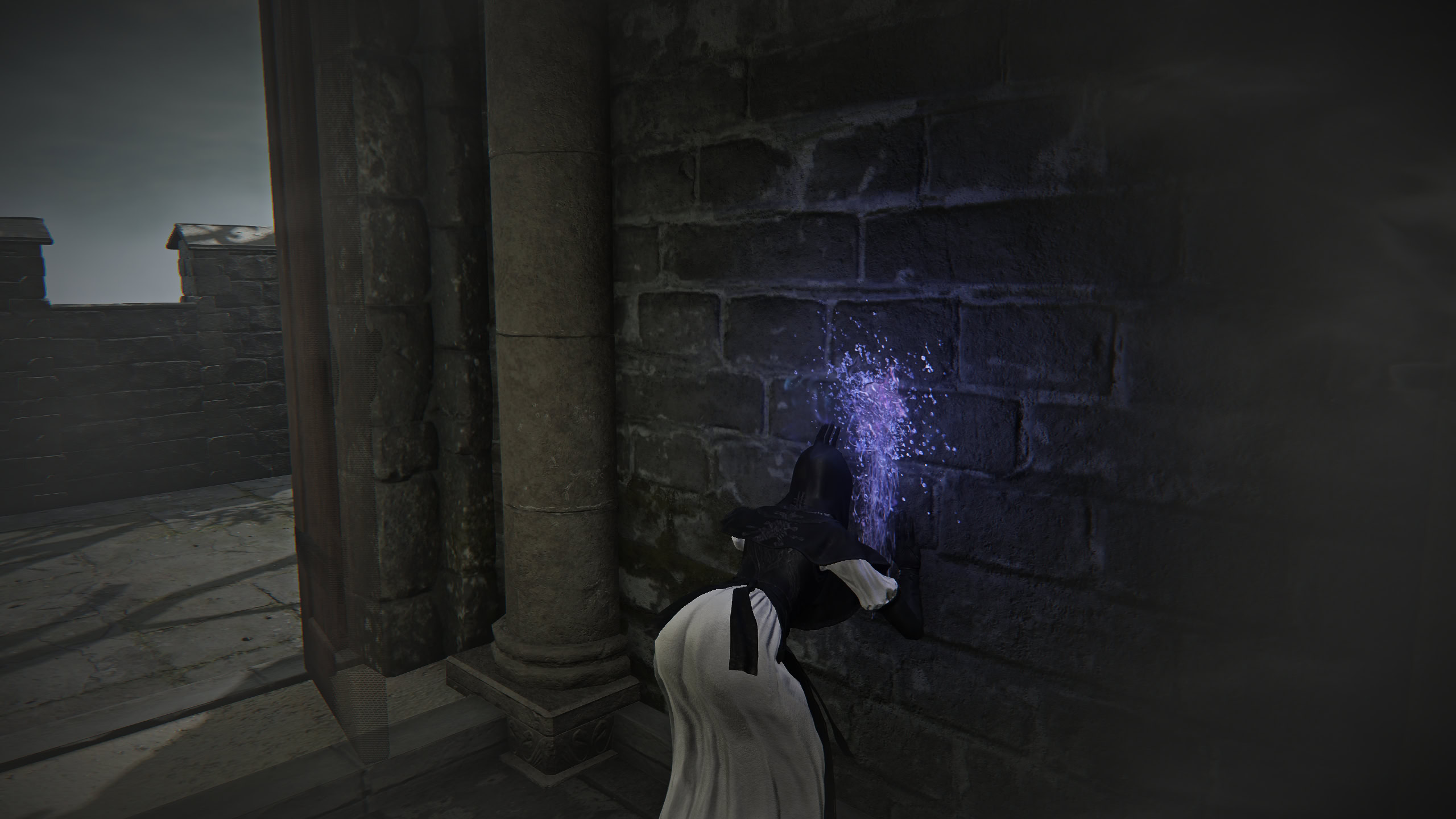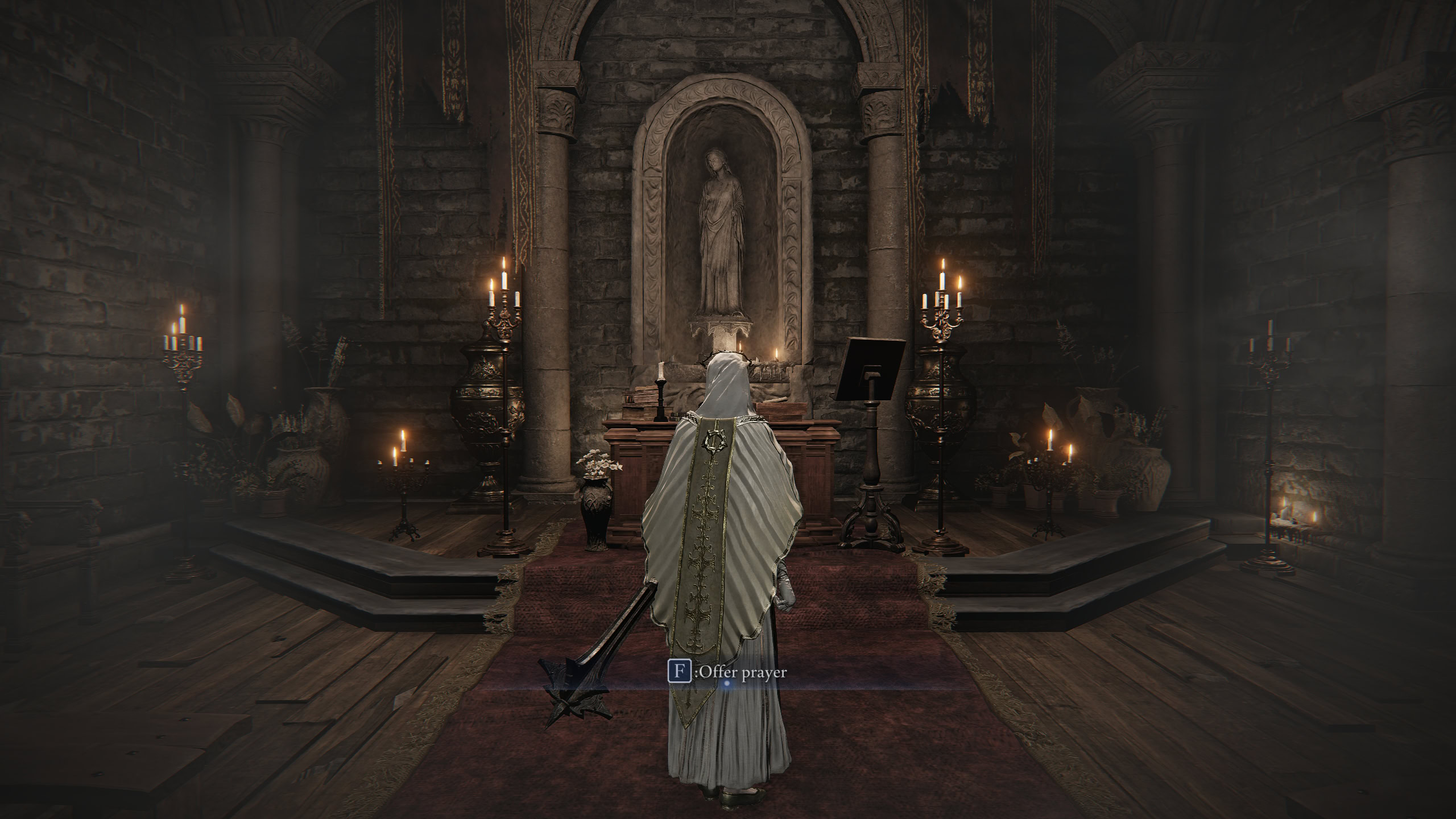 Despite having the courage to lick goop off the wall in a public area of a shared space, the Undertaker can’t bring herself to pretend that the Scholar is dead. Head over to the Chapel near the altar and a prompt will appear so she can pray about it.