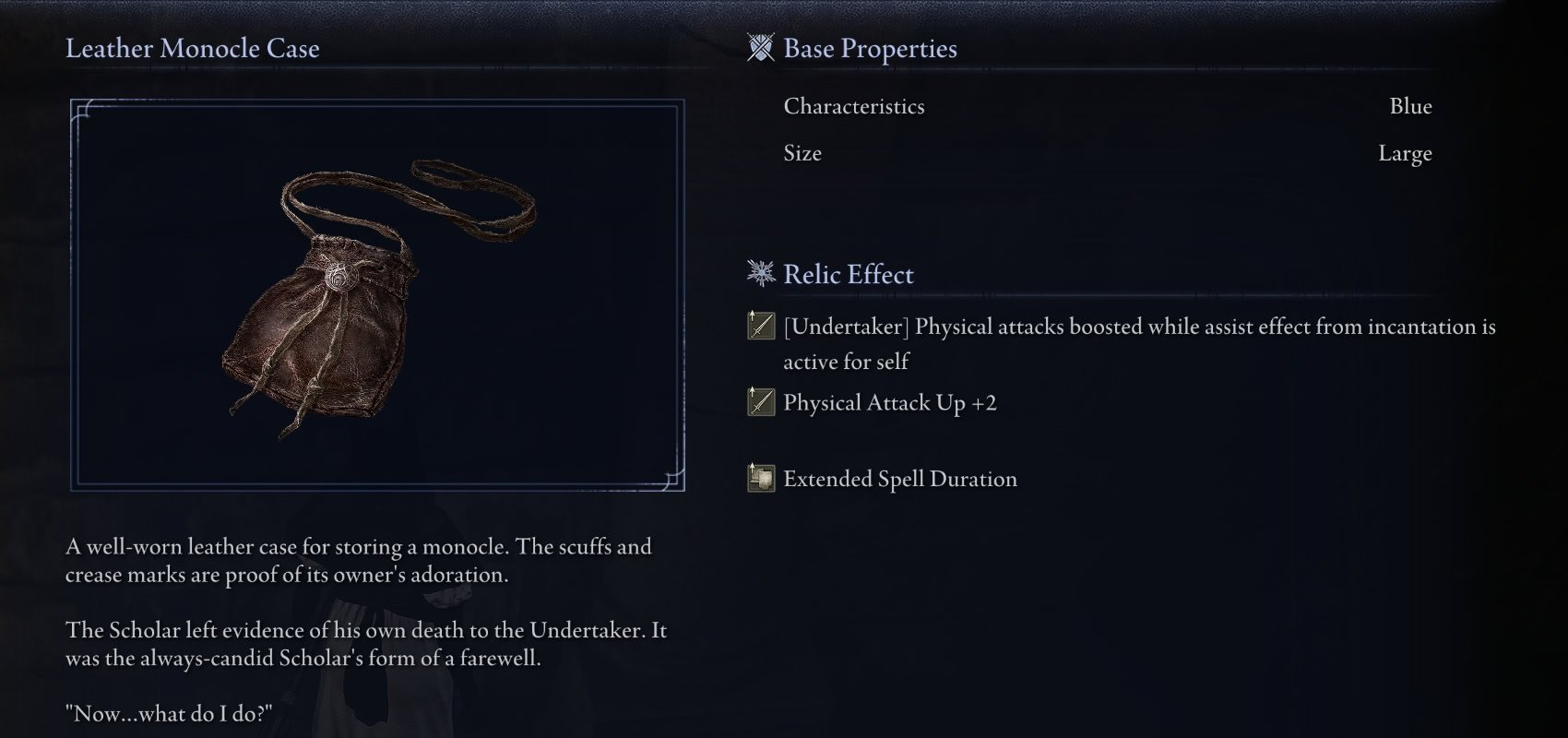 He gives you his Leather Monocle Case to show others as proof of his departure. It is a Key Item, but it’s also a very nice Relic, like Wylder’s Earring-tier.