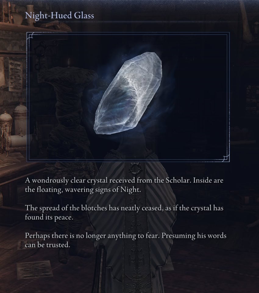 He’ll give you the Night-Hued Glass as a reward, which (hopefully!) spells the end for your walli-pop days. Keep talking to him and he’ll also give you some Bundled Paper, after which the Remembrance concludes.