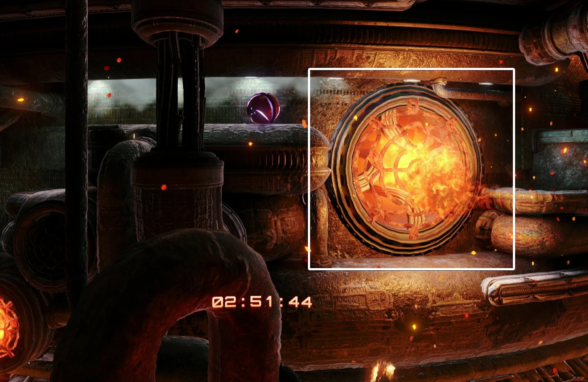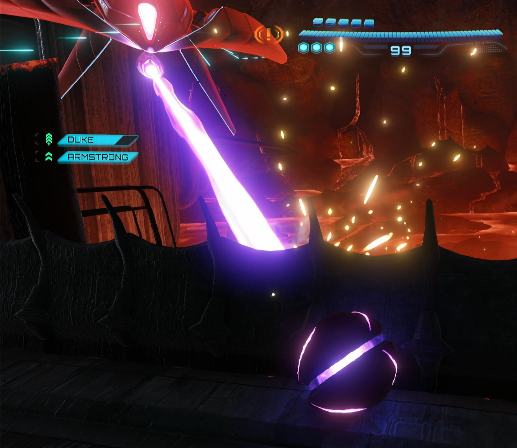 Shoot one of the four areas exposing the lava within and immediately turn into a Morph Ball. All the vents will activate and the boiler will spin rapidly above you. Repeat this process to turn off the boiler and return to the Entry Bay with Duke.