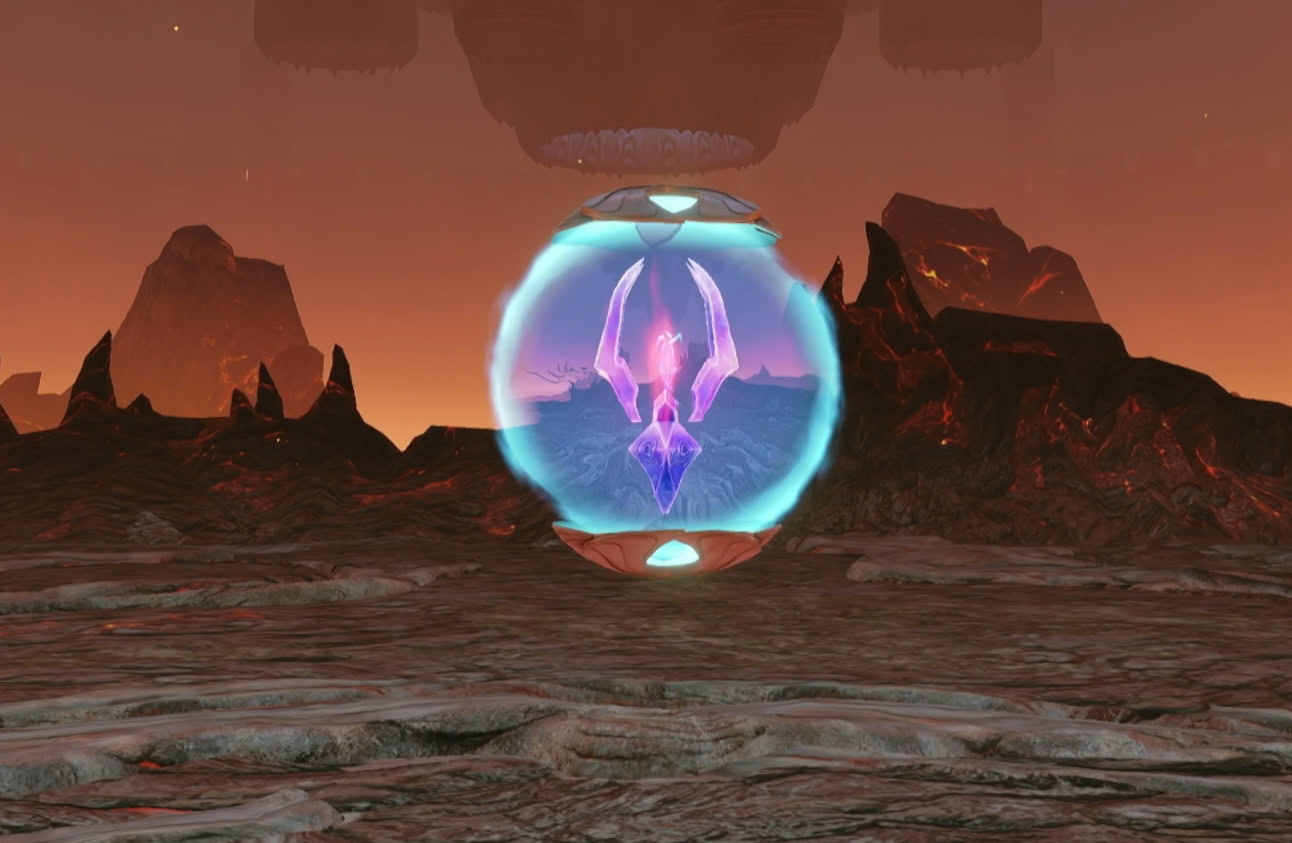 When you’ve reached the Sacred Shrine, stare into the eye of the statue to claim the fourth Master Teleporter Key. When you return to the physical word, don’t jump off the shrine.