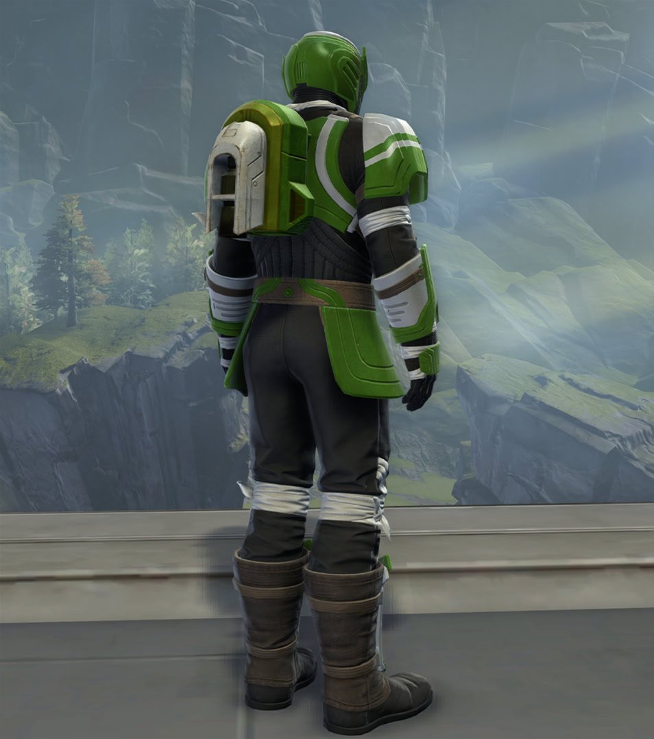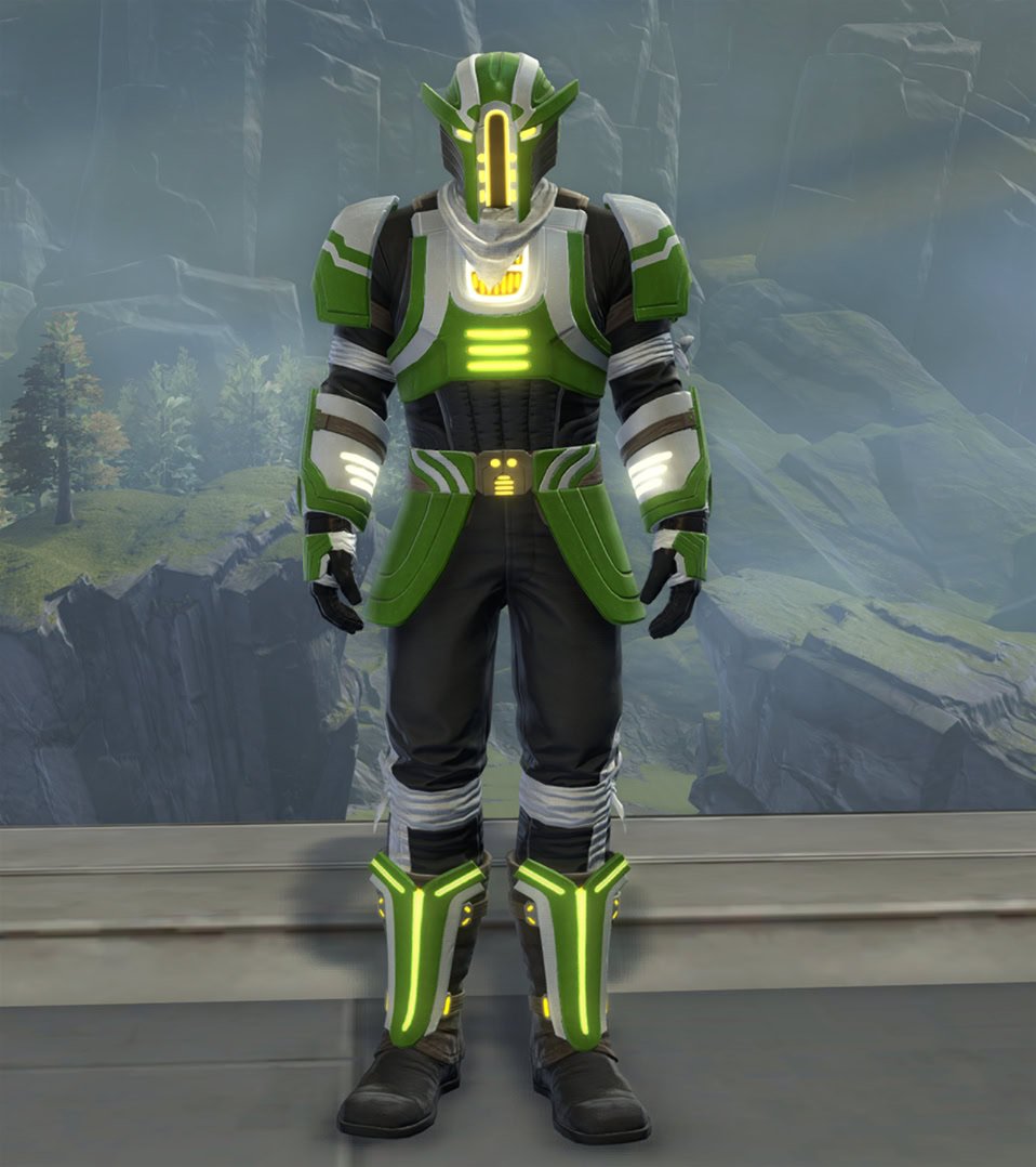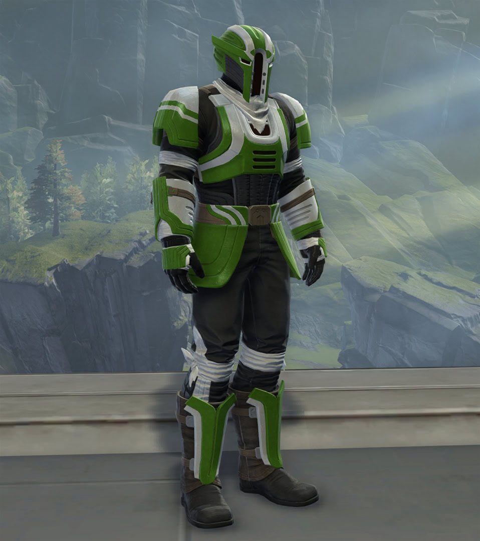 The Outer Rim Combatant set has green and white painted plate armor with black clothing and less pronounced bandanas. It has yellow VFX lights on everything but the pants and is obtainable from the PvP Seasons Vendors for 6 PvP Seasons Tokens.