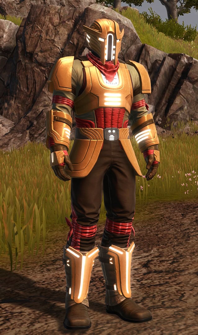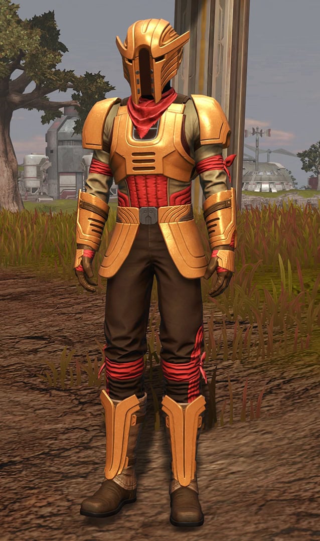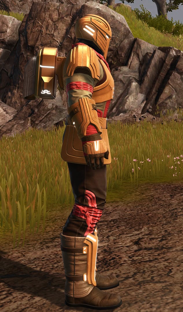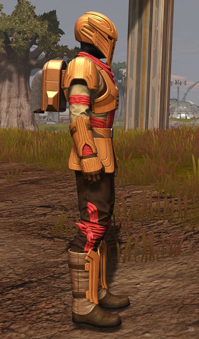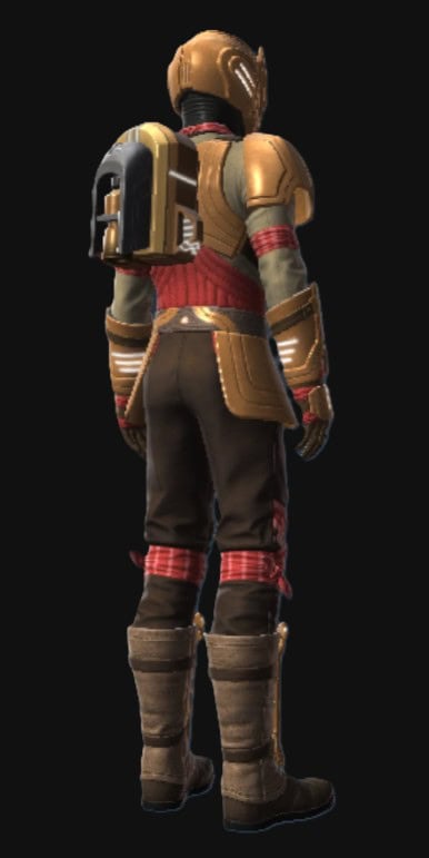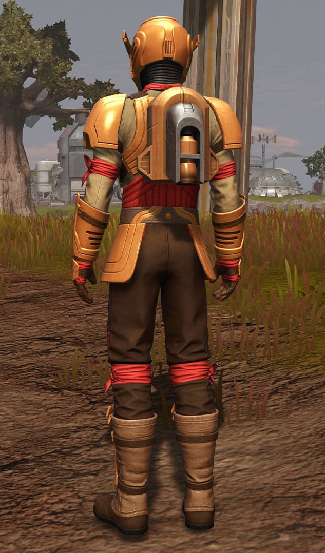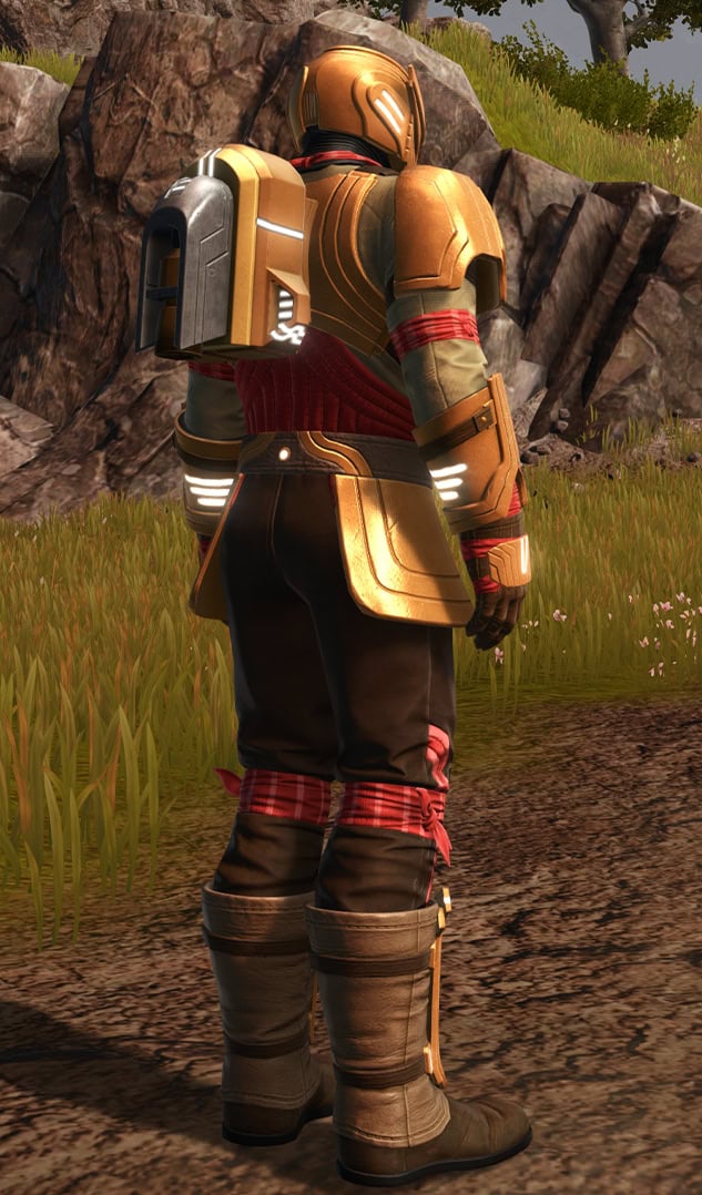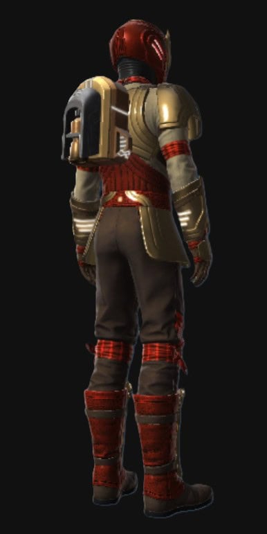 Below, you can see how the Outer Rim Destroyer Set looks when it’s dyed with the Metallic Gold and Metallic Red Dye, which does make it look snazzier, but tragically, the jetpack on the armor does not dye.