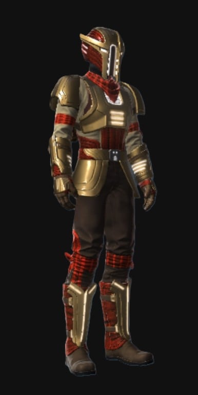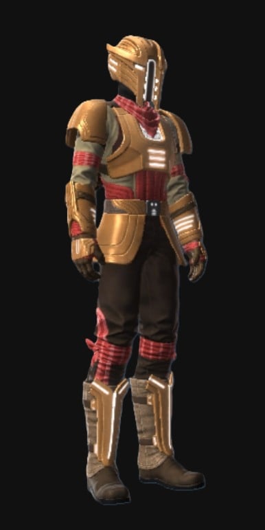 The Outer Rim Destroyer set has bronze plate armor with brown-tan clothing and red accents. It has white VFX lights on everything but the pants and is obtainable from the PvP Season 9 Track from levels 1-16.