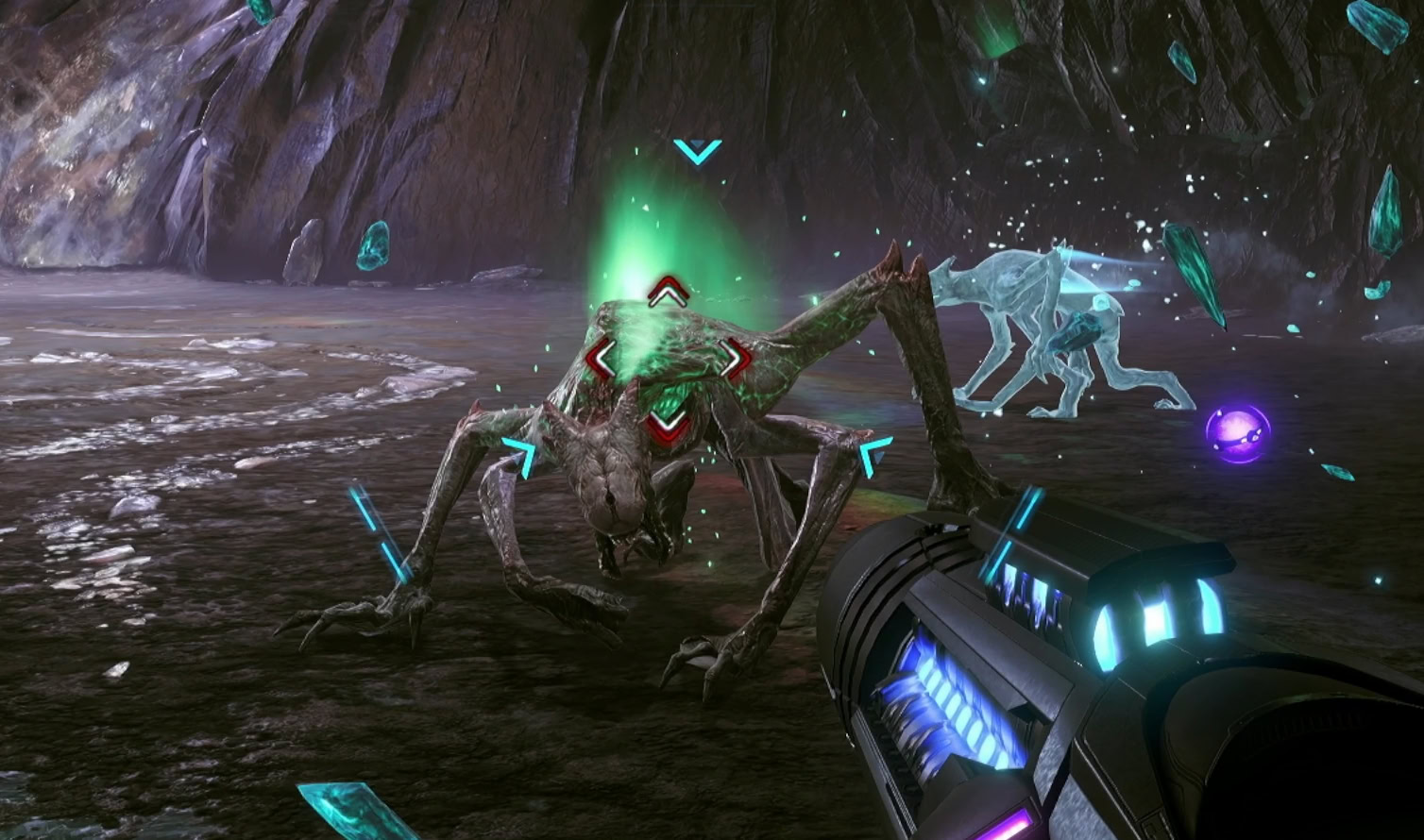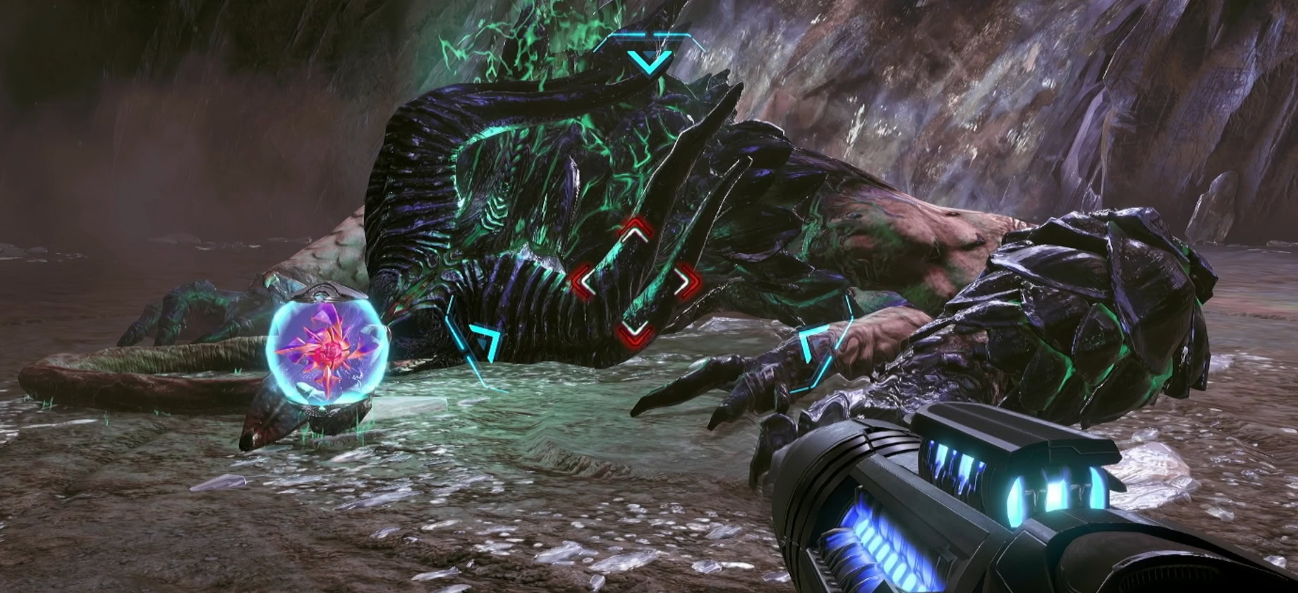 After you shoot it off the walls the second time, the Omega Griever gains a new ability. It can great a massive ball of green goo that it throws at you. It’s easy to dodge with your side dash.