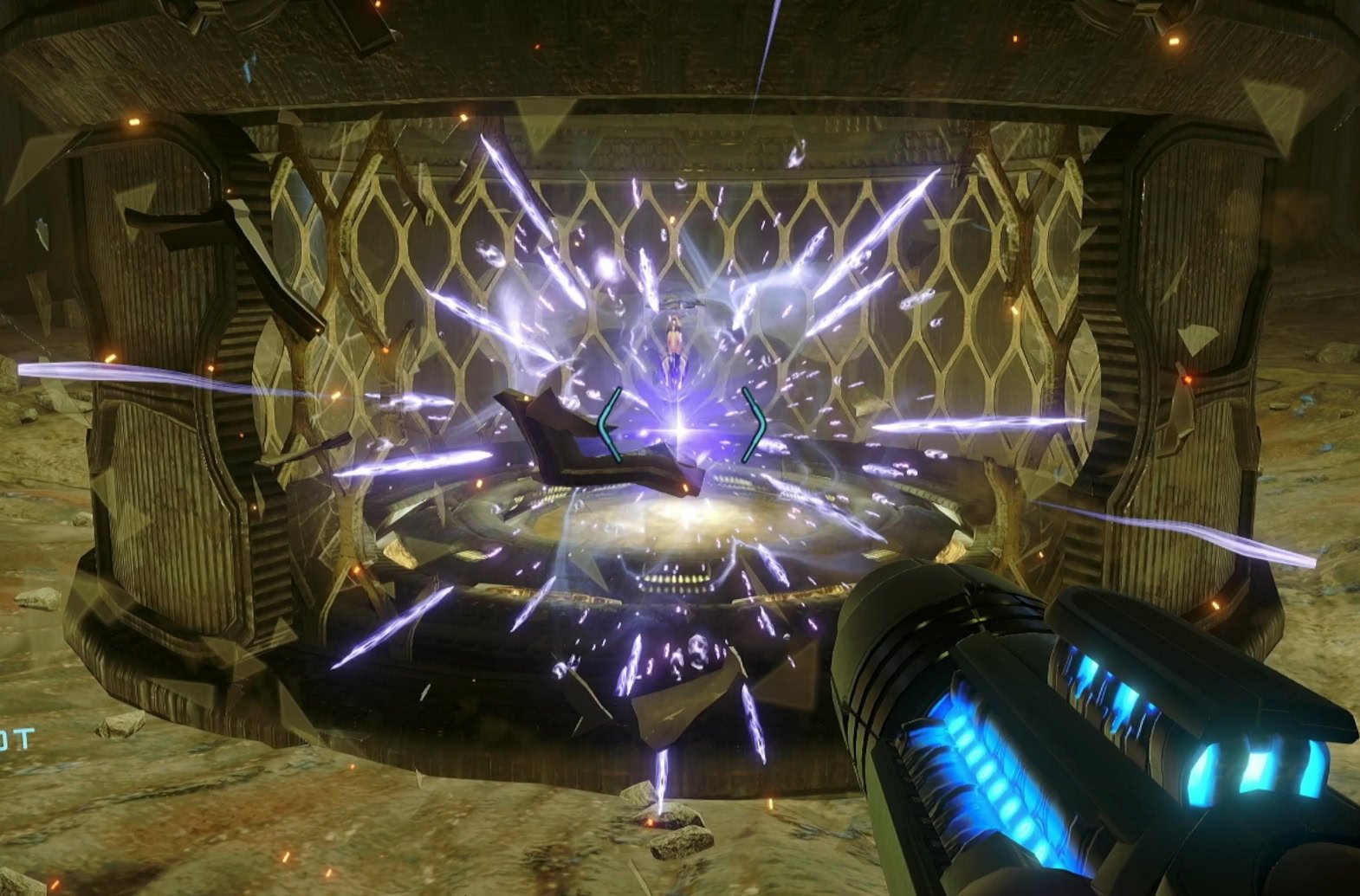 Defeat the Grievers that appear then scan the glass of the cage so VUE shatters it. Blast it off with a Charge Beam then claim the Super Missiles.