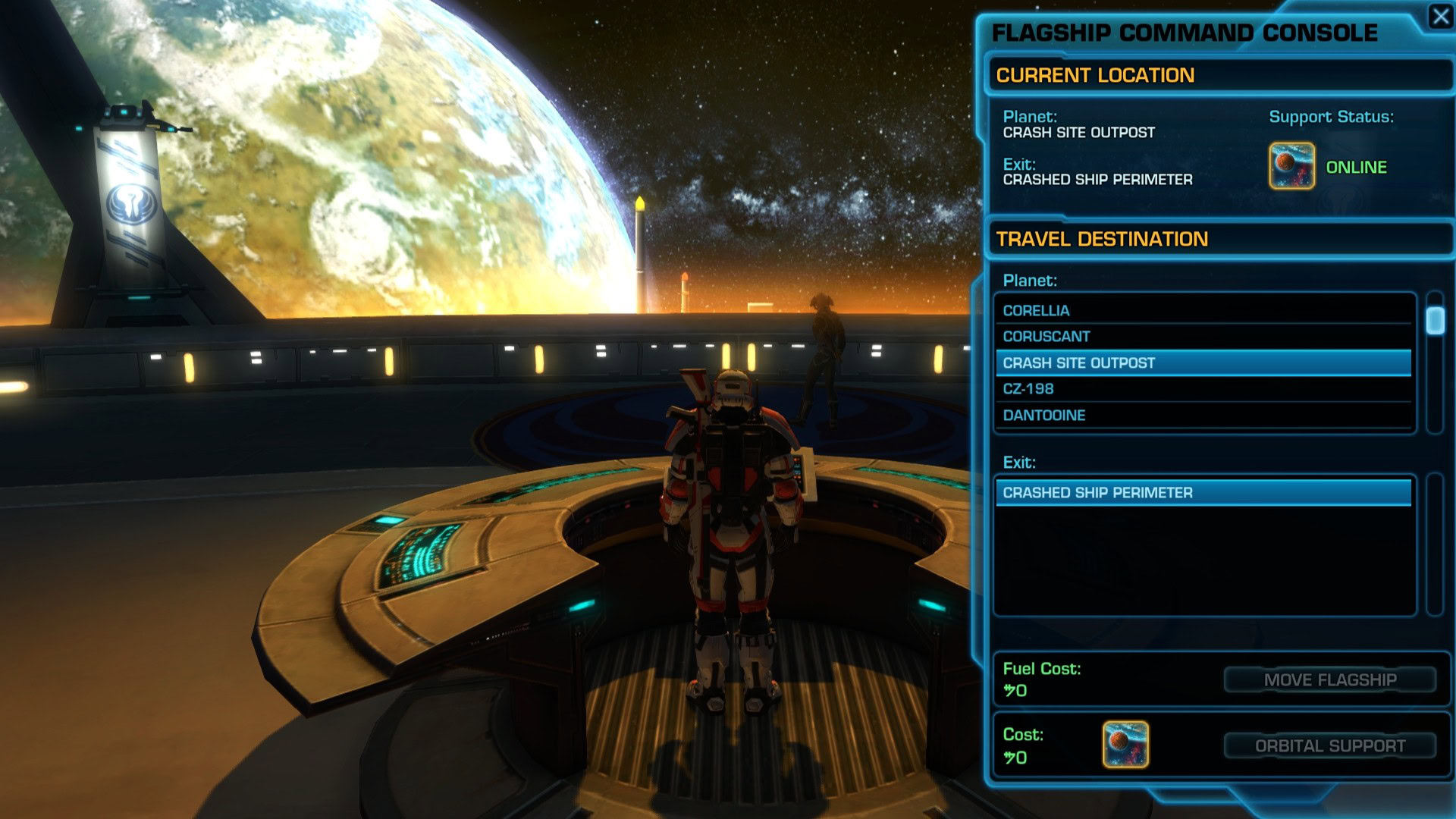 Landing Zones are treated as separate planets within the Flagship Command Console Interface, so you’ll want to set the Travel Destination to Crash Site Outpost, not Dantooine. Don’t forget to enable Orbital Support as well!