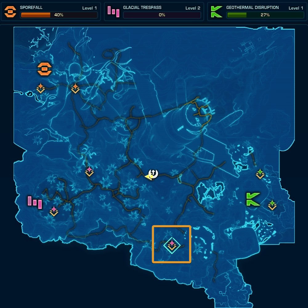 Frozen Flora are clickable objects that exist in the ecotone (transitional area) connecting Sporefall to Glacial Trespass. You can get here quickly by using Maintenance Tunnel Access Pass to go to Ecotone Access GS (the “GS” stands for Glacial and Geothermal).