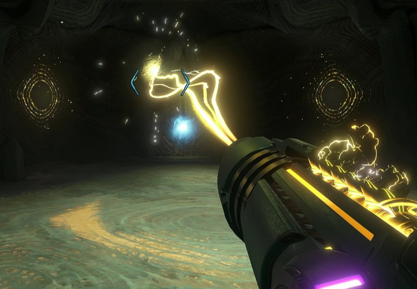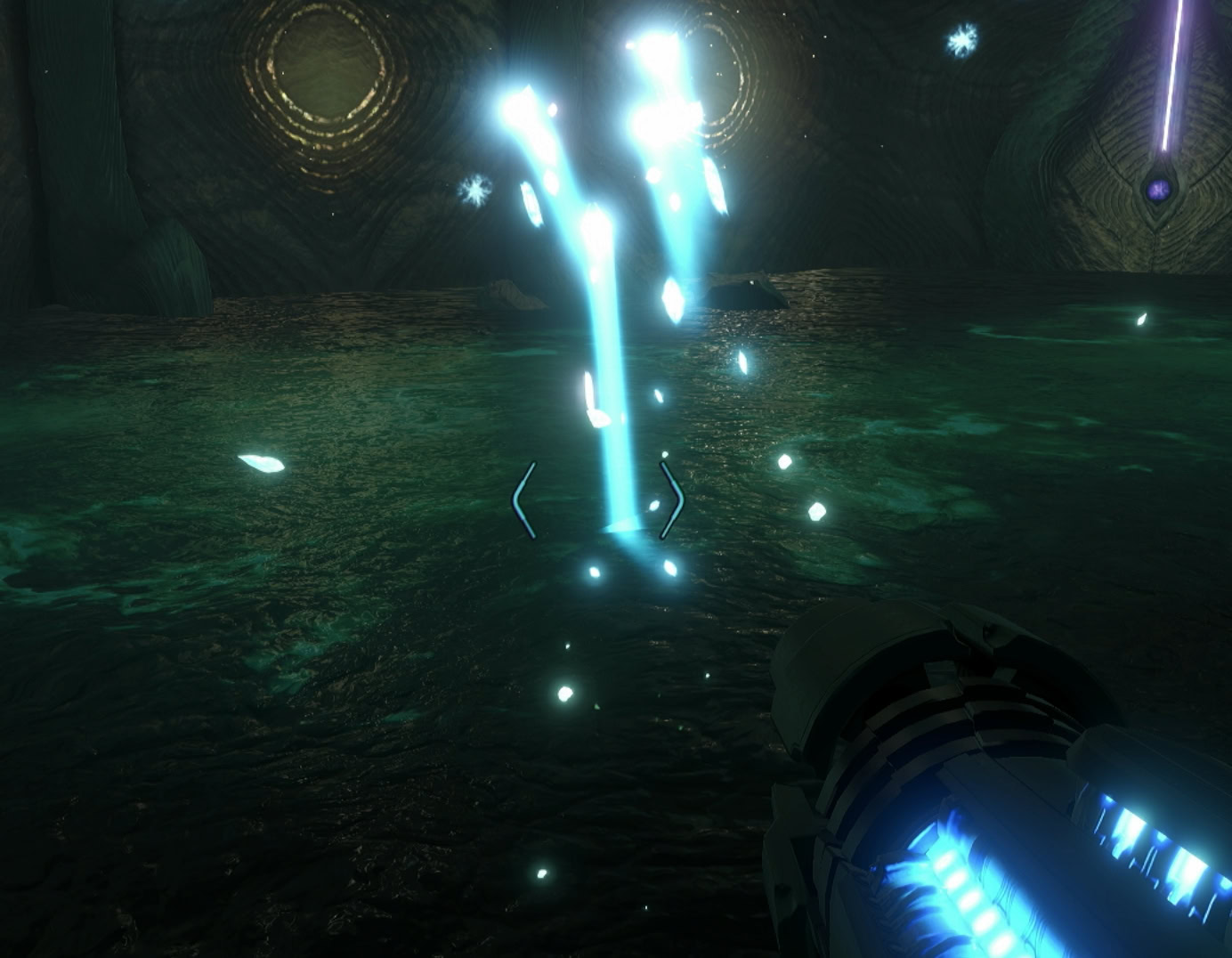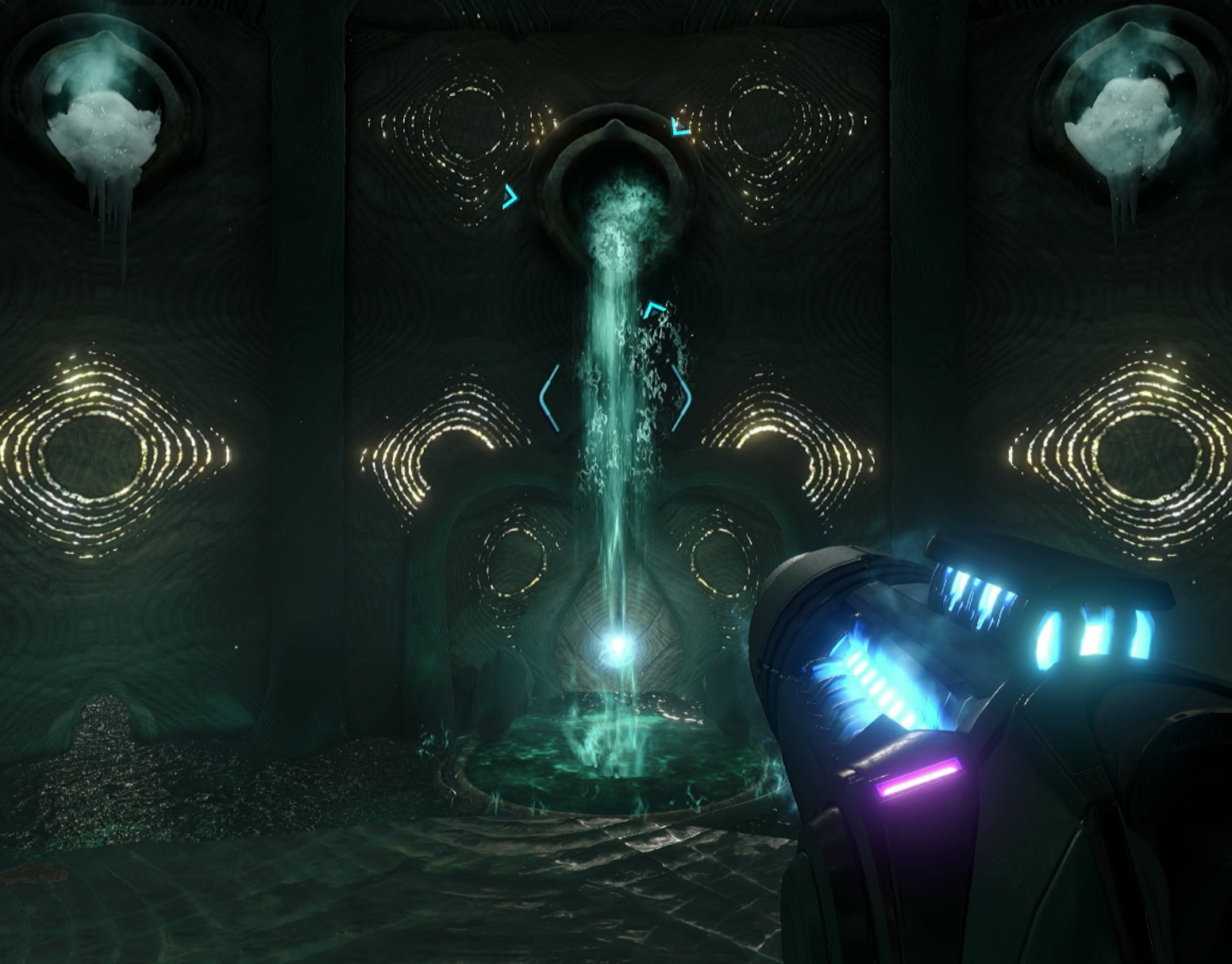 Before you will be 3 streams of water with a central structure blocking a door. Shoot the two streams on the side with the Ice Shot to add weight to the central structure. This opens the door ahead, leading to the Gift of Ice.