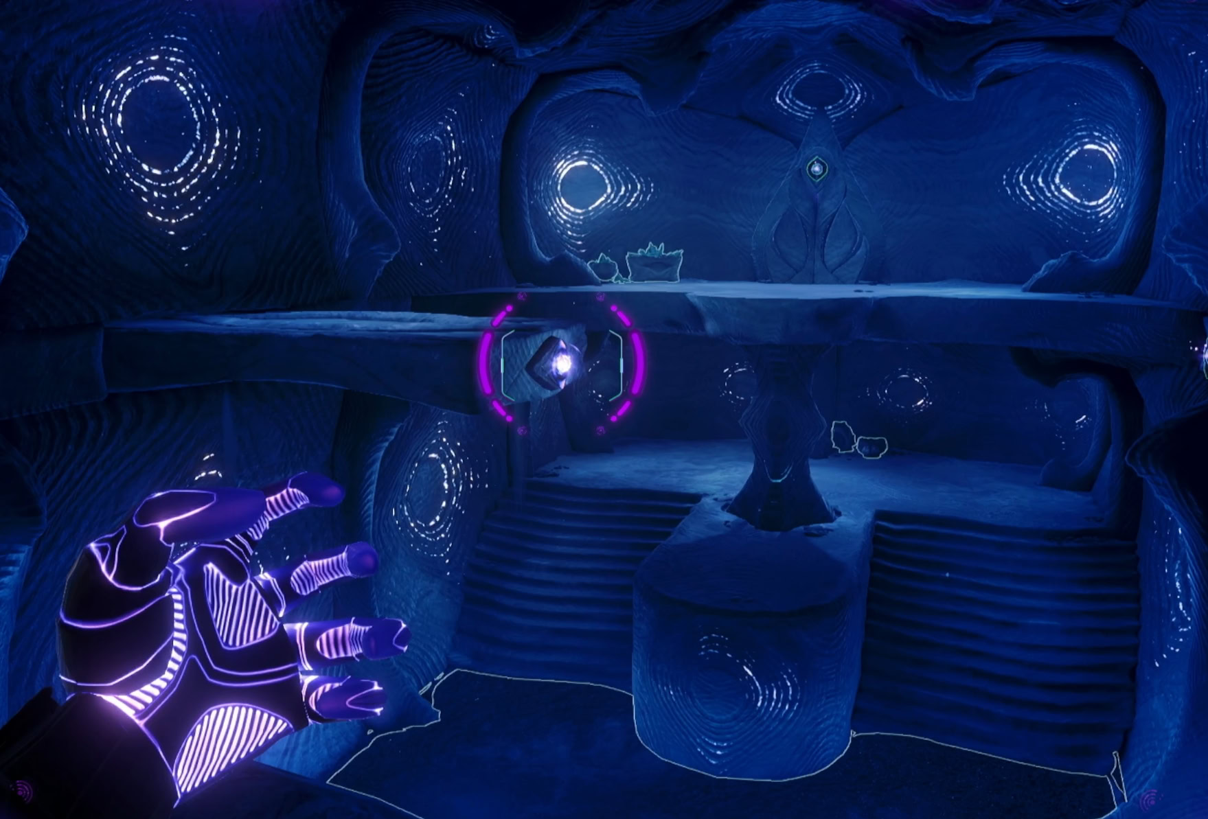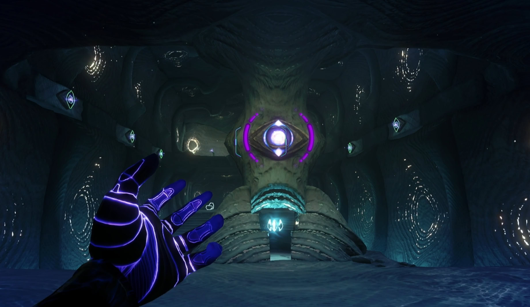 On the upper platforms, there are two stands that contain motes you can launch into the walls. These will push out platforms you can use to get to the door across the room. Power the door with a spare mote and claim your Ice Shot upgrade.