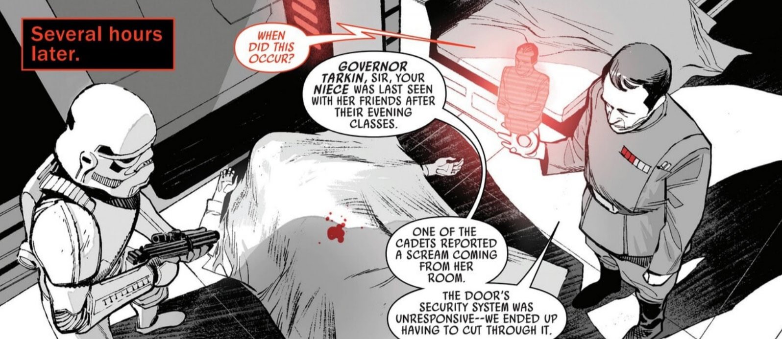 At the Royal Imperial Academy, Sydna Tarkin (niece of Grand Moff Tarkin) is murdered by a masked figure who managed to get into the facility without being detected and escaped without a trace.