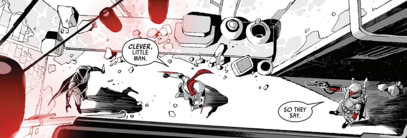 The fourth and final issue of this miniseries begins with the murder of a member of the Tarkin family. As one of the top families of Eriadu, they simply can’t allow it to go unpunished. Boba Fett is hired to track and bring in the killer, dead or alive.