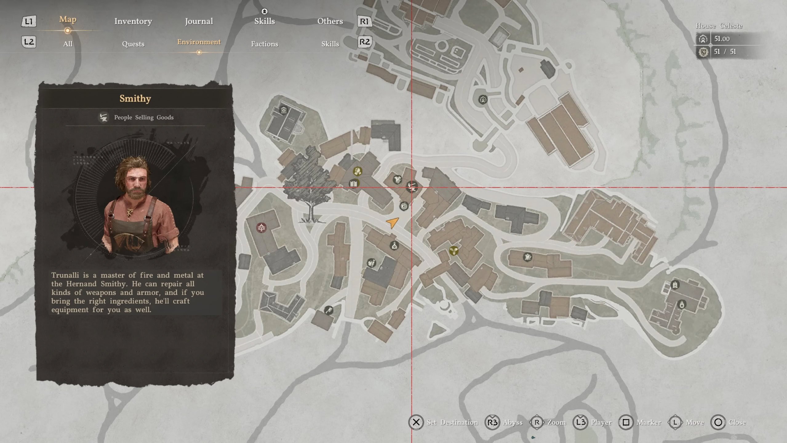 The last way we can acquire gear is to have it crafted at the Smithy. This requires us to bring the required materials to the Smithy and have our weapon forged. Opening our Map will allow us to locate the Smithy in town, if one is present.