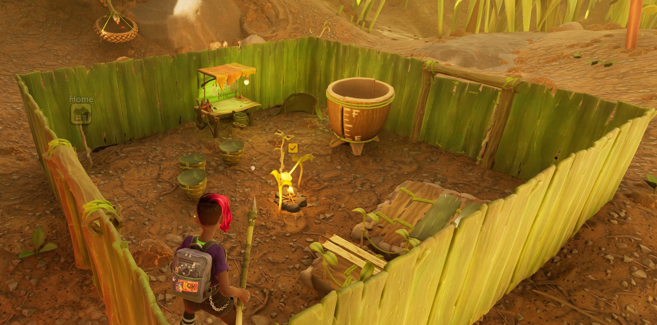 To get started on this, we have a small laundry list of materials to gather. In total, we’ll need the following items to get our base setup with all the essential amenities we’ll need. This means a Lean-to, Workbench, a few Storage Baskets, a Roasting Spit, and of course, A Trail Marker, as well as Walls and Doors for our base. This is for a 3×3 base; a larger base will require more Grass Planks, and that’s it.