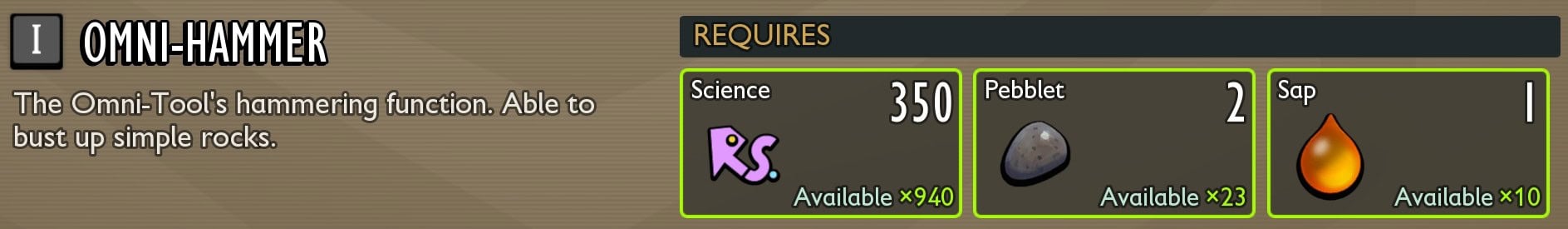 Assuming we still have Pebblets and Sap from the Onboarding Facility as well, we’ll also be able to unlock the Tier 1 Omni-Hammer.