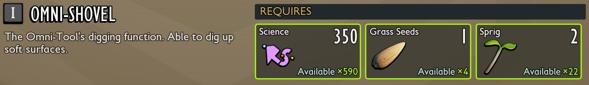 We’ll be able to use the Grass Seed we picked up earlier with a Sprig we should have leftover from the Onboarding Facility to craft the Tier 1 Omni-Shovel