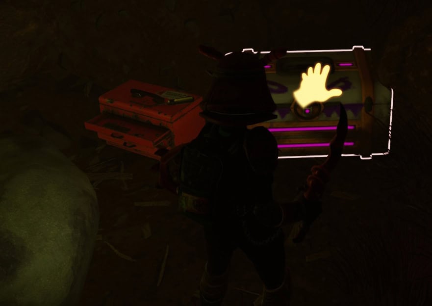 To the right of all of this, sitting atop a barrel and looking like part of the set piece here, is the Cryptic Recipe. This unlocks the Northern Shredders, a powerful, but short-range melee weapon we could craft if we got lucky with our Scorpion Drops. These are a direct upgrade over the Mitey Claws.