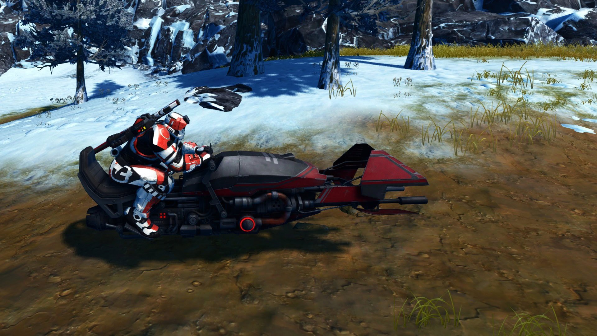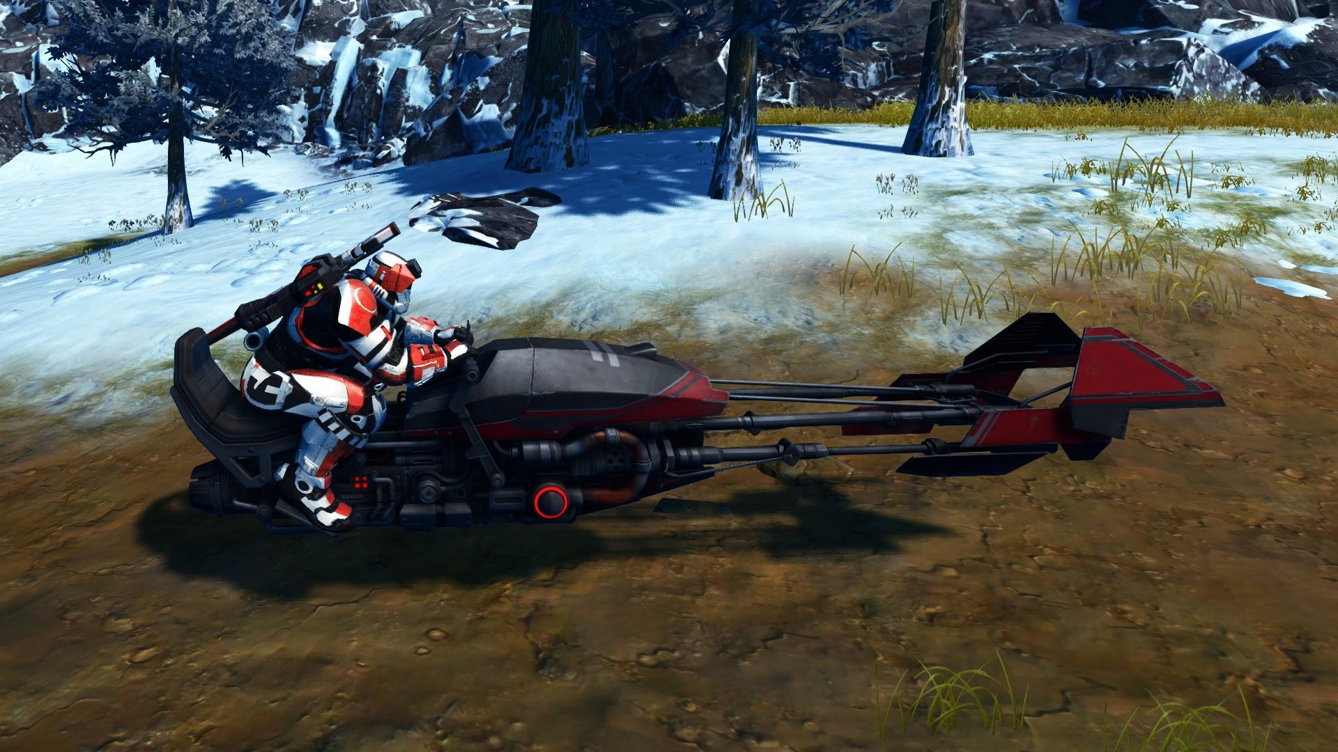 The K-NorCo speeder bike is featured in Star Wars Outlaws and is used by many NPCs. The D3M variant has a matte red and black paint job. It does not have Dynamic Mount Colors but does have a Mount Flourish.