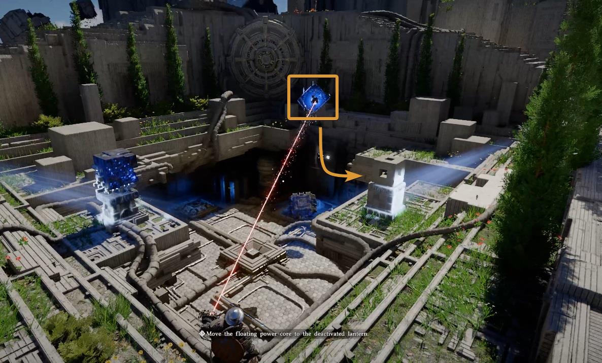 To gain access to the lower floor, you need to pull the floating cube and place it where the stone cube is located using Axiom Force (by pressing TAB / L3 / LS). Right in front of the lantern. You don’t need to worry about the stone cube; it’ll disappear the moment it’s placed correctly. Precision isn’t a must for this one