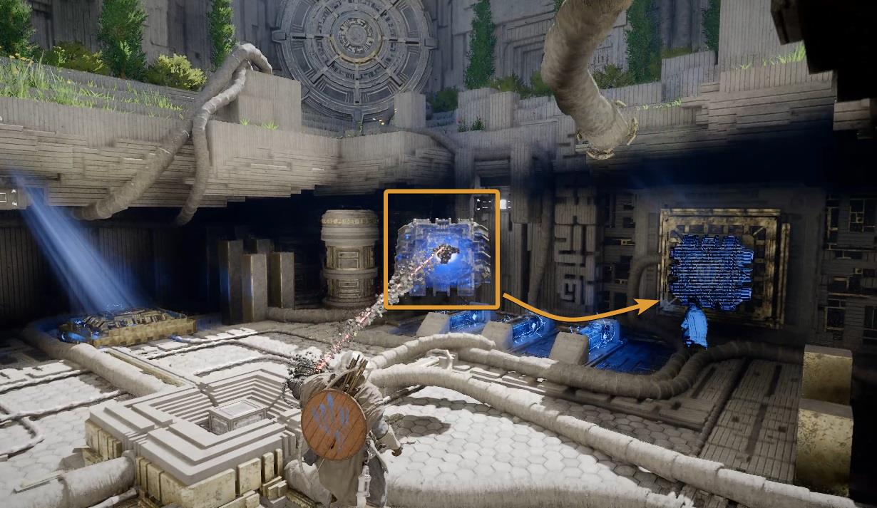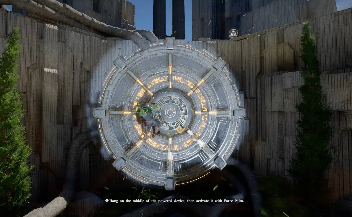 A small cinematic will trigger when you do this successfully. Go back to the upper level and head towards the big white circle that looks like some type of vault gate. Climb to the middle and hit it with Force Palm. You may need to do it multiple times if you aren’t positioned in the center.