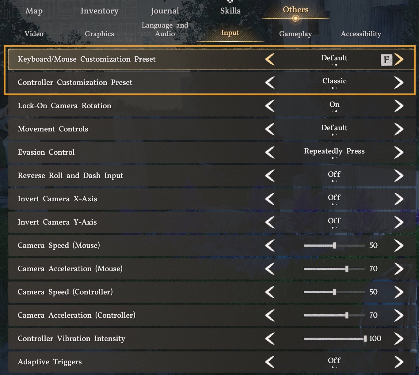 At the top of this section are the options for “Keyboard/Mouse Customization Preset” and “Controller Customization Preset”. These can be opened using these inputs:
