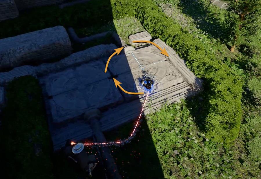 Repeat the process with the second disk. From the same starting position as the first disk, three times clockwise. The idea is that the power goes from pipeline to pipeline. If done correctly, it will open the gates of the massive building.
