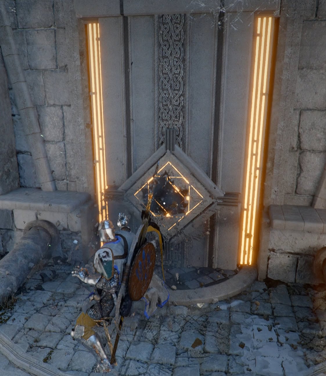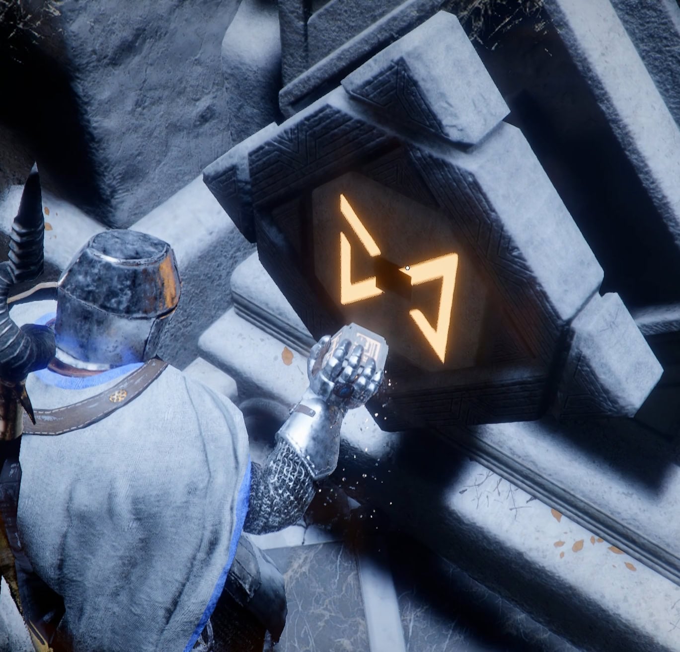 When you reach the spire, you’ll see a wall with glowing runes along the wall. Three of these wall panels have a small square hole in them.