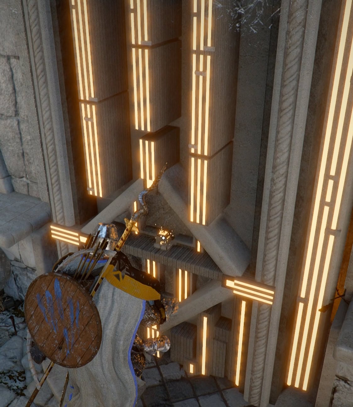 You’ll notice the circle rune is on the third light up on both the mural and the actual puzzle itself. To solve this puzzle, you’ll need to align the panels on the wall rails in a specific order.