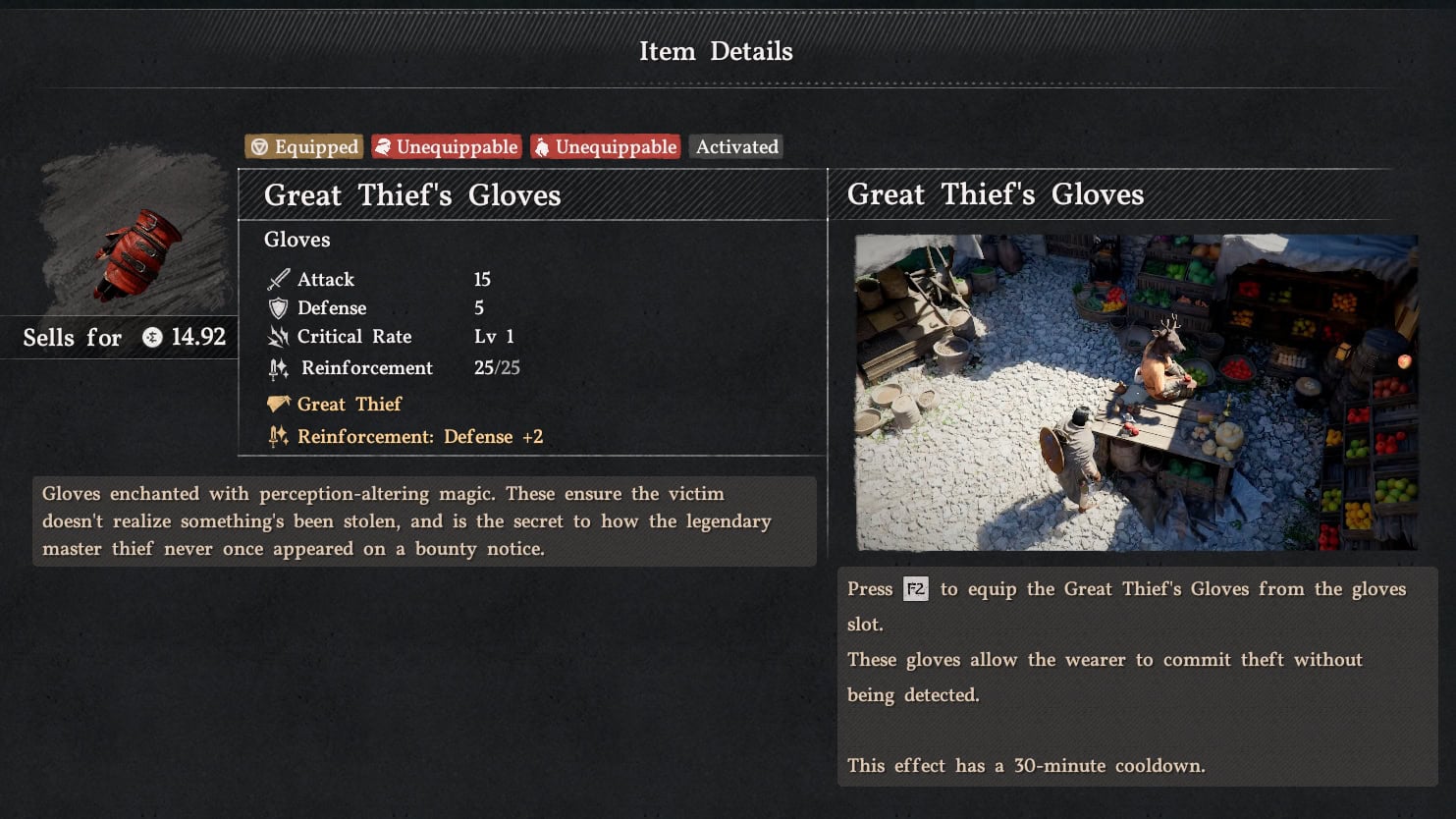 At the end, your reward is the Great Thief’s Gloves, which are a special piece of non-upgradeable equipment that have the passive effect to let you steal something without anyone noticing, but the effect has a 30 min cooldown.