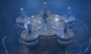 Examine the metal disc on the pillar and you’ll find you’re able to rotate portions of the disc. Rotate both of them until you see sparks and you’ll unlock the Spire of Soaring. The image on the disc will appear similar to an eye.