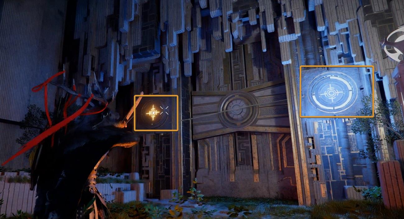 Walk to the door and hit both lighting panels with an arrow. If you struggle doing it at normal speed, use Focus Shot. Then walk towards the door and use Nature’s Grasp to open it.
