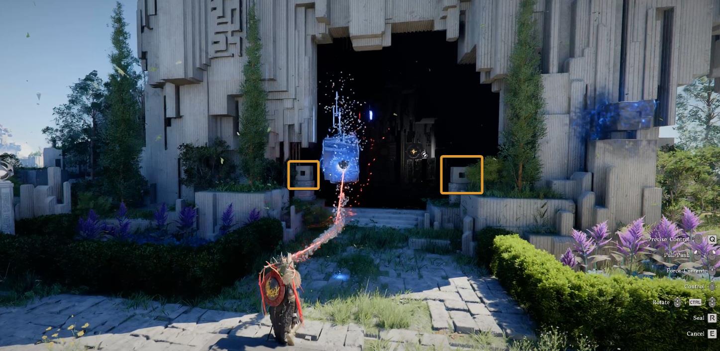 Look for the energized cubes; one is on the far left, while the other is on the right side of the entrance. Grab them with Axiom Force and place them in place of the stone blocks.