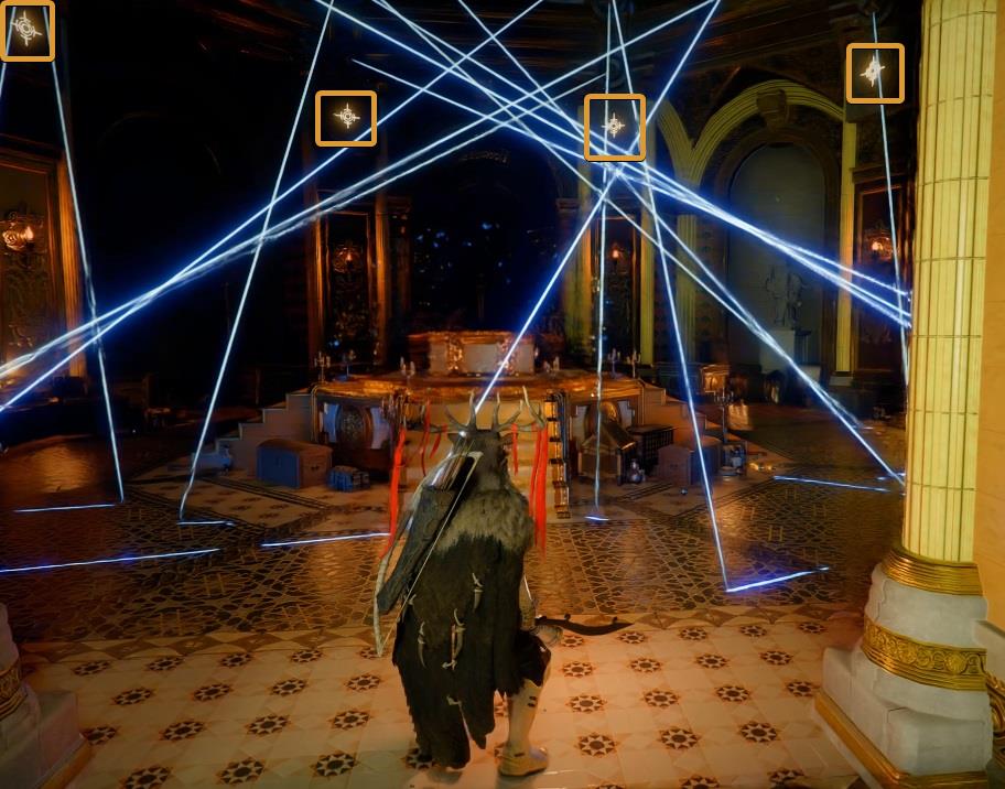 Meters ahead, you’ll find a huge room with lasers all over the place. Use Focus Shot on the lights above the four pillars. Only after shooting all four with Focus Shot will the lasers deactivate. Then walk to the center and grab the Golden Sword.