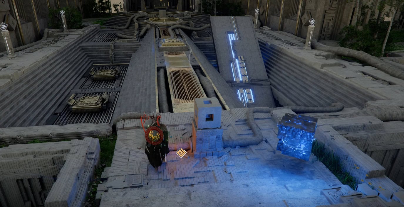 Head down and grab the panel located in the nearby room. You have to repeat the same process as with the last one. Place it close to the “roof”, use the teleporter, and remove the energy cube from the stone block.