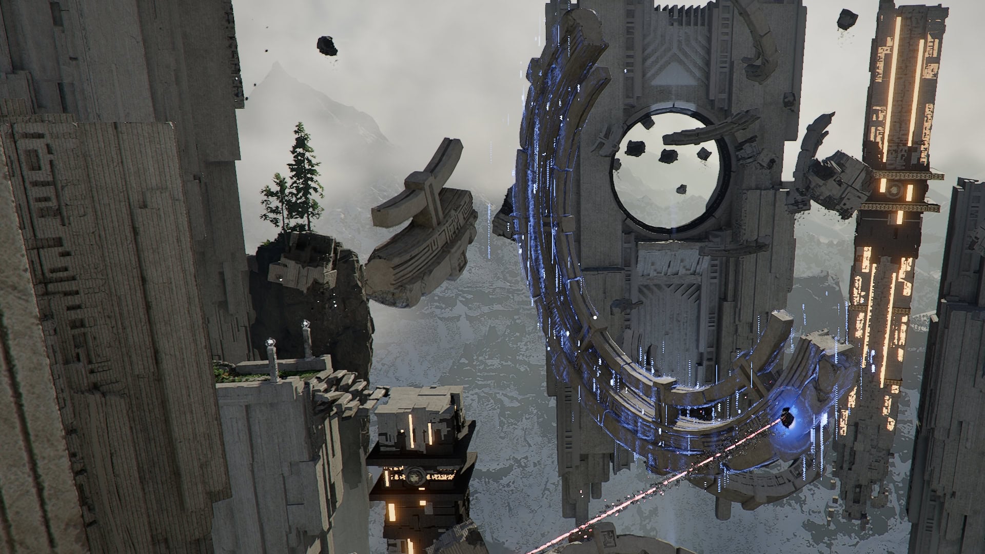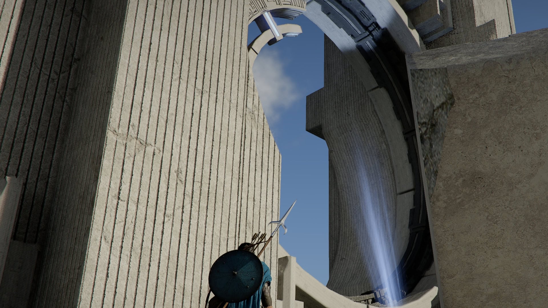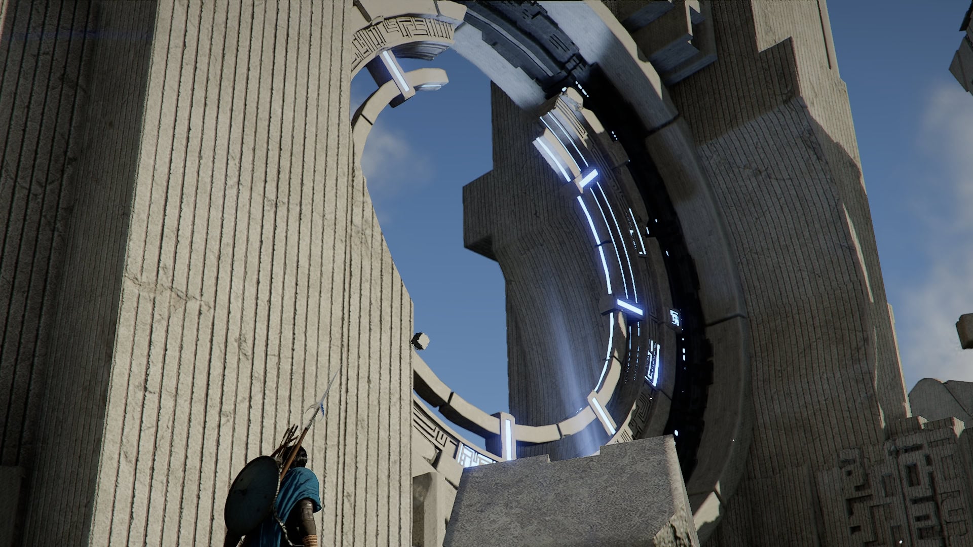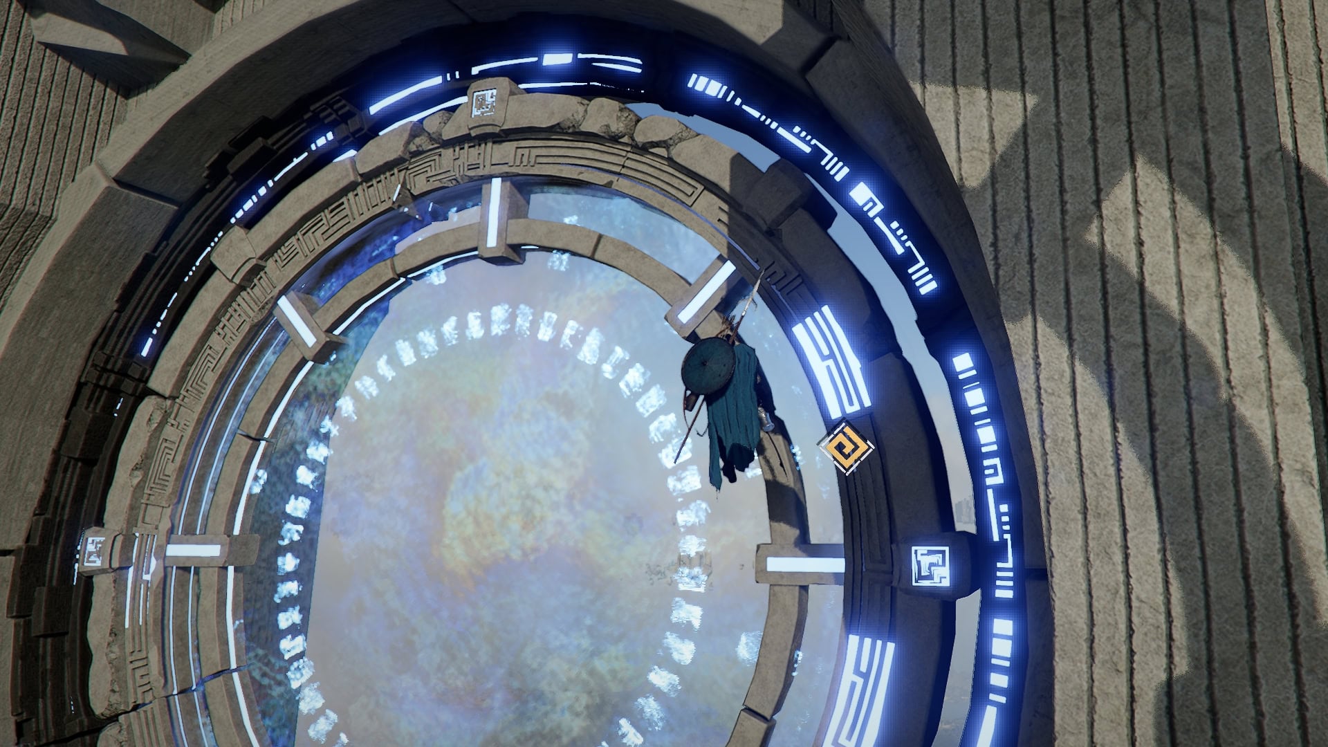 From this new position, turn towards the higher structure and climb up. You’ll notice the ring up here is missing pieces.