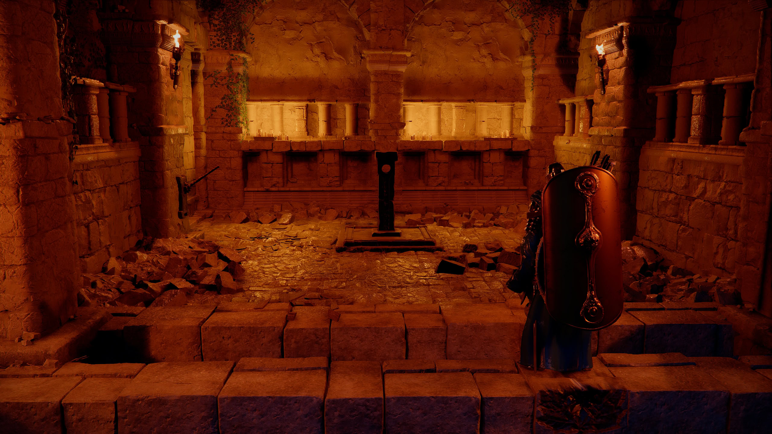 When the five tiles have been pressed in, the wall will lower to reveal an Abyss Cresset. Claim the artifact within and pull the lever to the left to open a path out of the ruins. But before you go, there’s still some loot to be picked up.