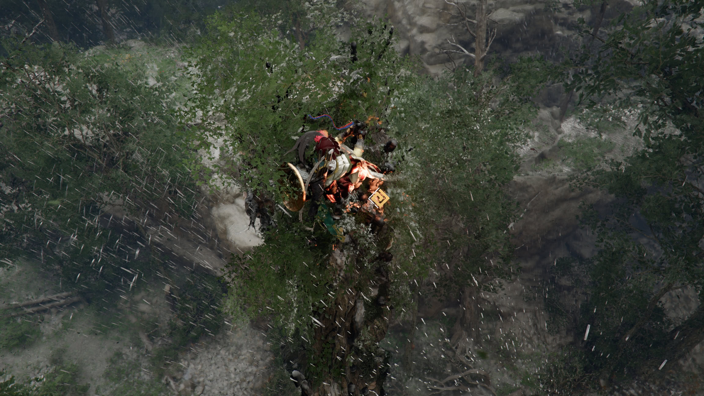 The relic is on its head, and while the giant walking tree is climbable, it’s impractical to climb up from its legs. Use the conveniently placed diving boards or a hill to jump onto its torso and grab the relic. You can’t fight the tree.