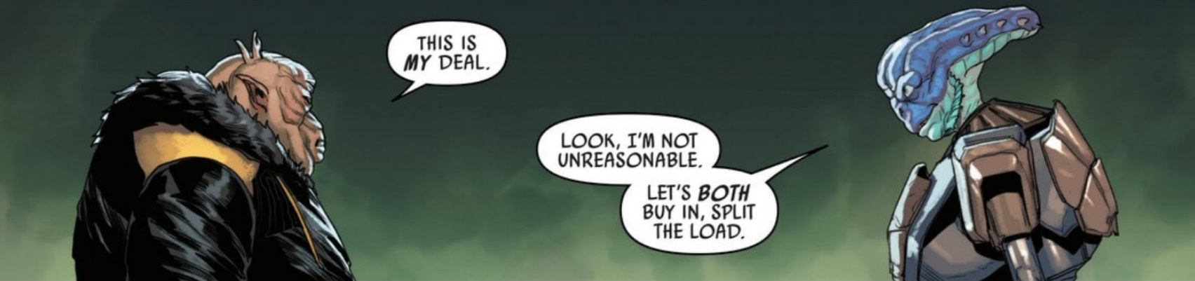 This issue shows an event that is perfect to set up a rivalry between two criminals. I won’t be too specific to avoid spoilers, but I’ll just say it’s over a ridiculous amount of money. A quarter of what Cassian Andor stole on Aldhani, to be precise.