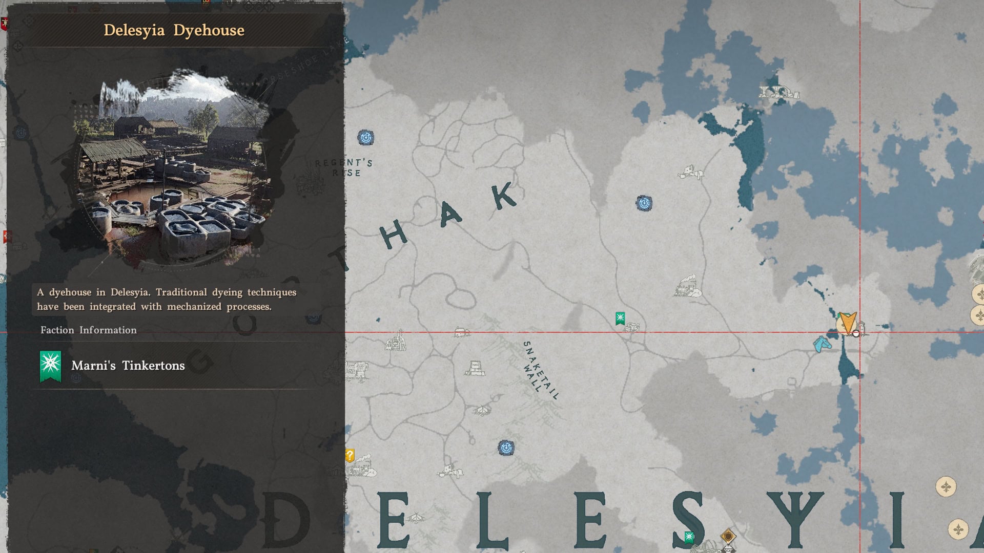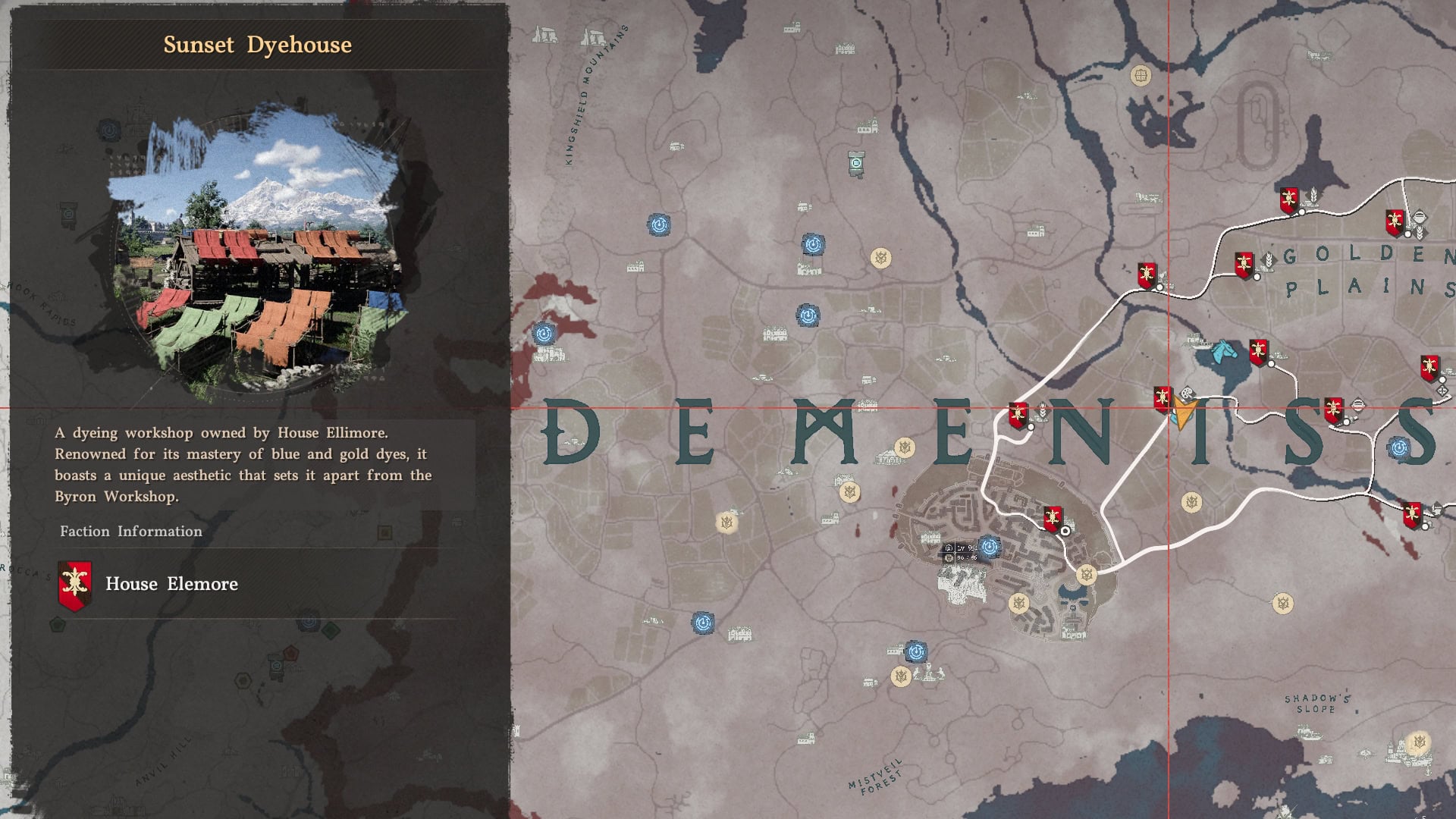 Each Dyehouse (dye vendor) is associated with a specific hue (main color) and sells a shade of it. Visiting them unlocks access to the color with Oliver the Dyer at Howling Hill. You can find 2-3 Dyehouses in each region of Pywel, typically on the outskirts of major cities.