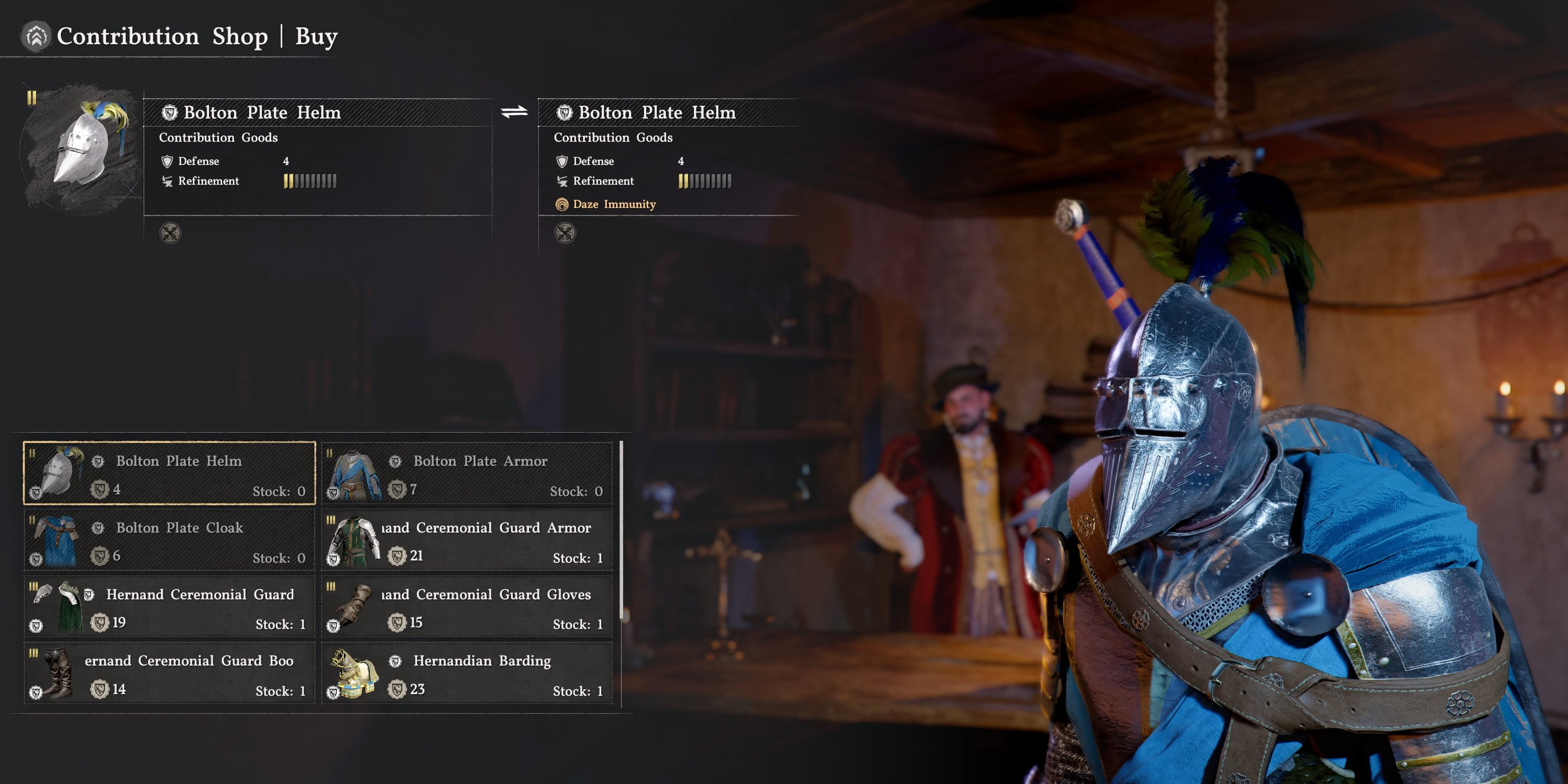 You can purchase the Bolton Plate Helm from the Contribution Shop at Hernand Castle in Hernand Town in Hernand. It costs 4 Hernand Contribution Tokens.