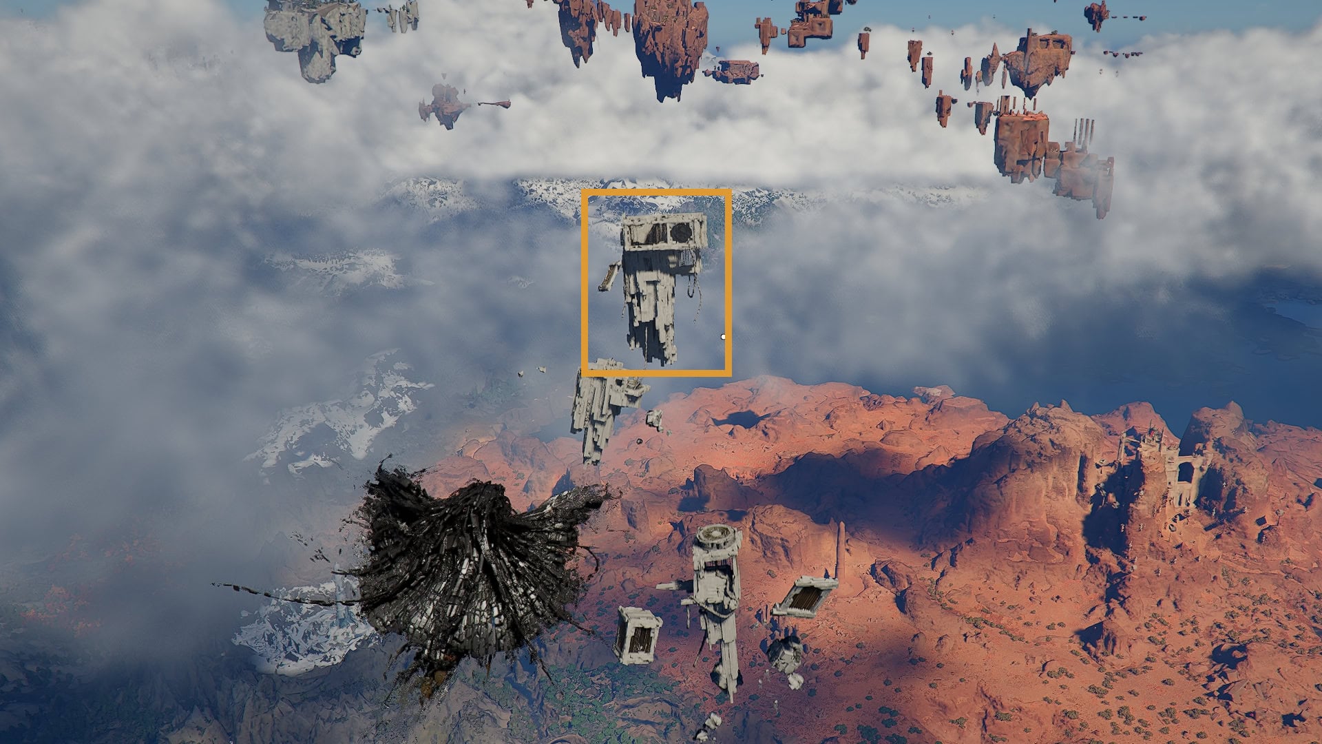 On the next structure with fans just ahead of this one, if you look to the north, you’ll see a bunch of structures floating off in the distance. You’ll want to aim to reach the farthest one using the highest fan on the top of this structure.