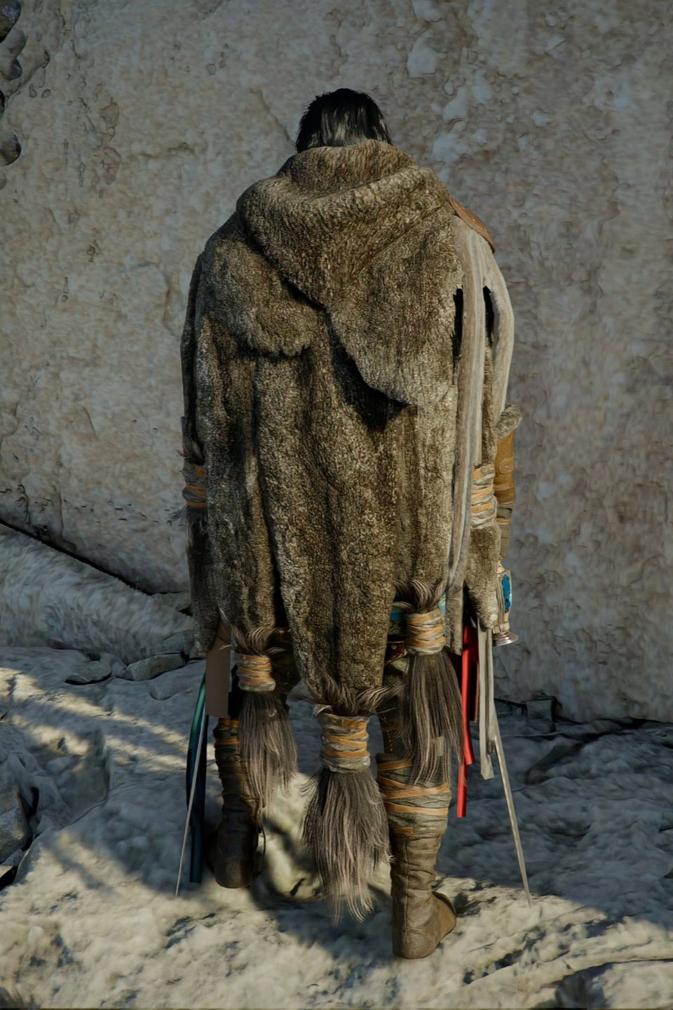 The Hungering Fang Leather set is obtainable by all players in Crimson Desert and features a nondescript pelt cloak over layers of embroidered brown and tan leather with Pailunese cerulean and burn orange accent colors.