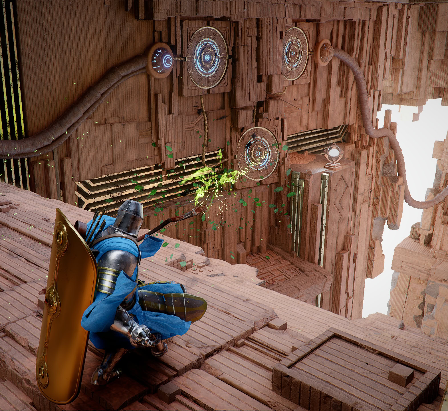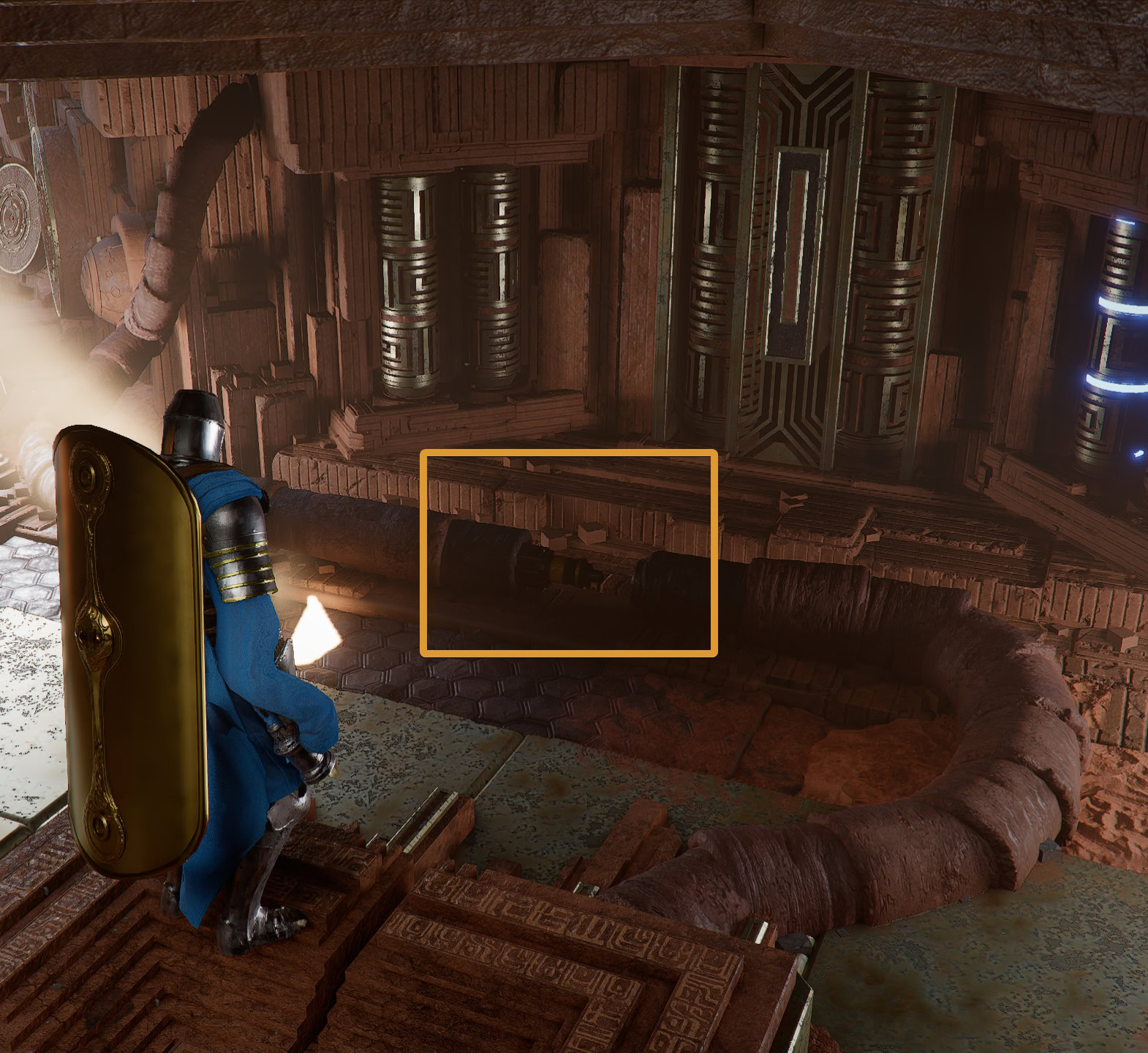 When you reach the Throne of Truth, you’ll find an inactive fan and a square hole in front of it. Drop down and you’ll find a disconnected conduit. Connect the conduit then go to the left to find an opening with numerous circular push switches.