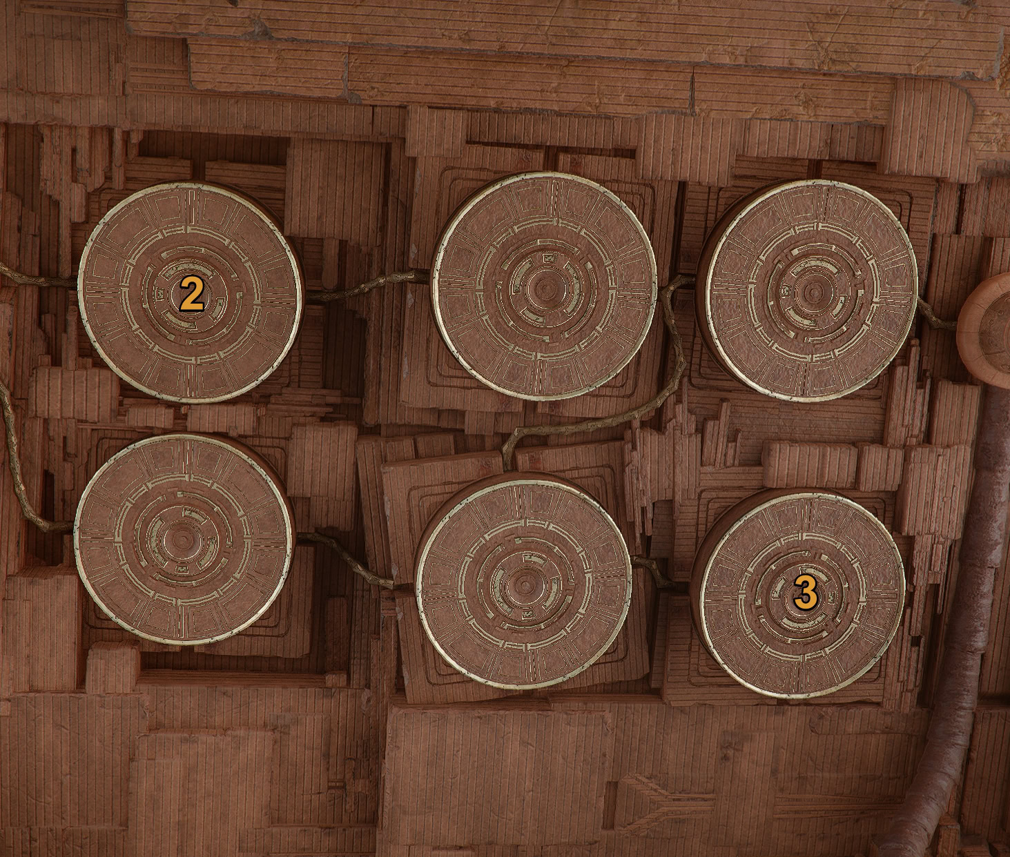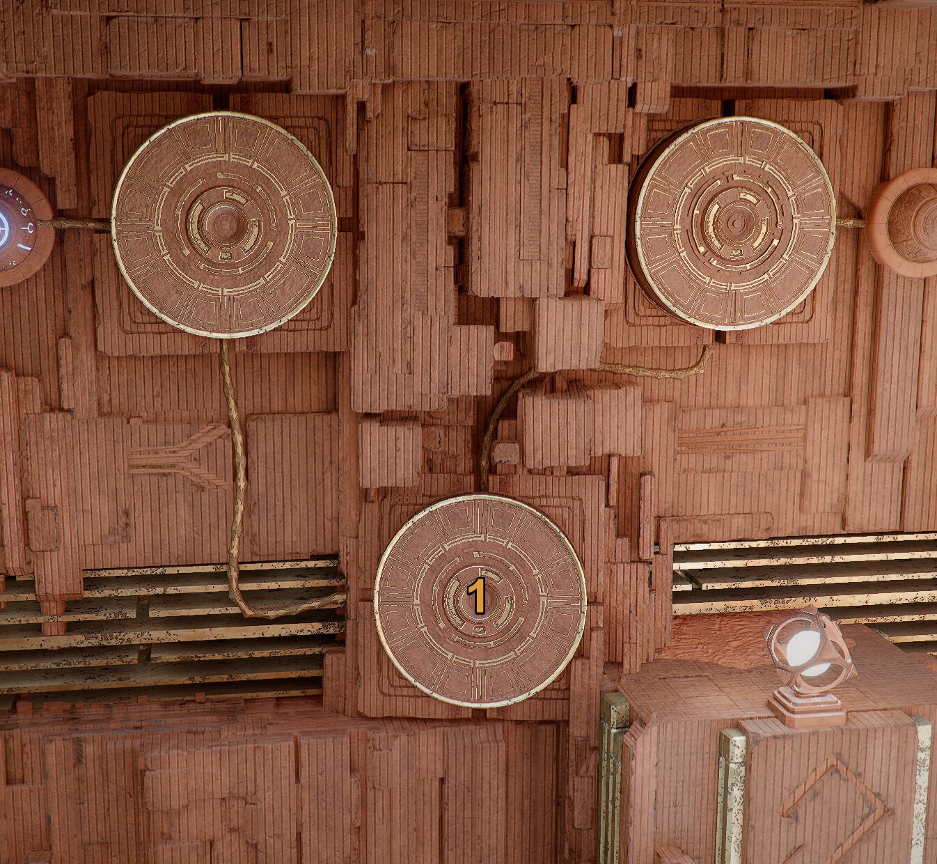 The next puzzle in the chain, is Dimensional Labyrinth. It involves pushing rotating grates to adjust power flows to fuel the final switch.