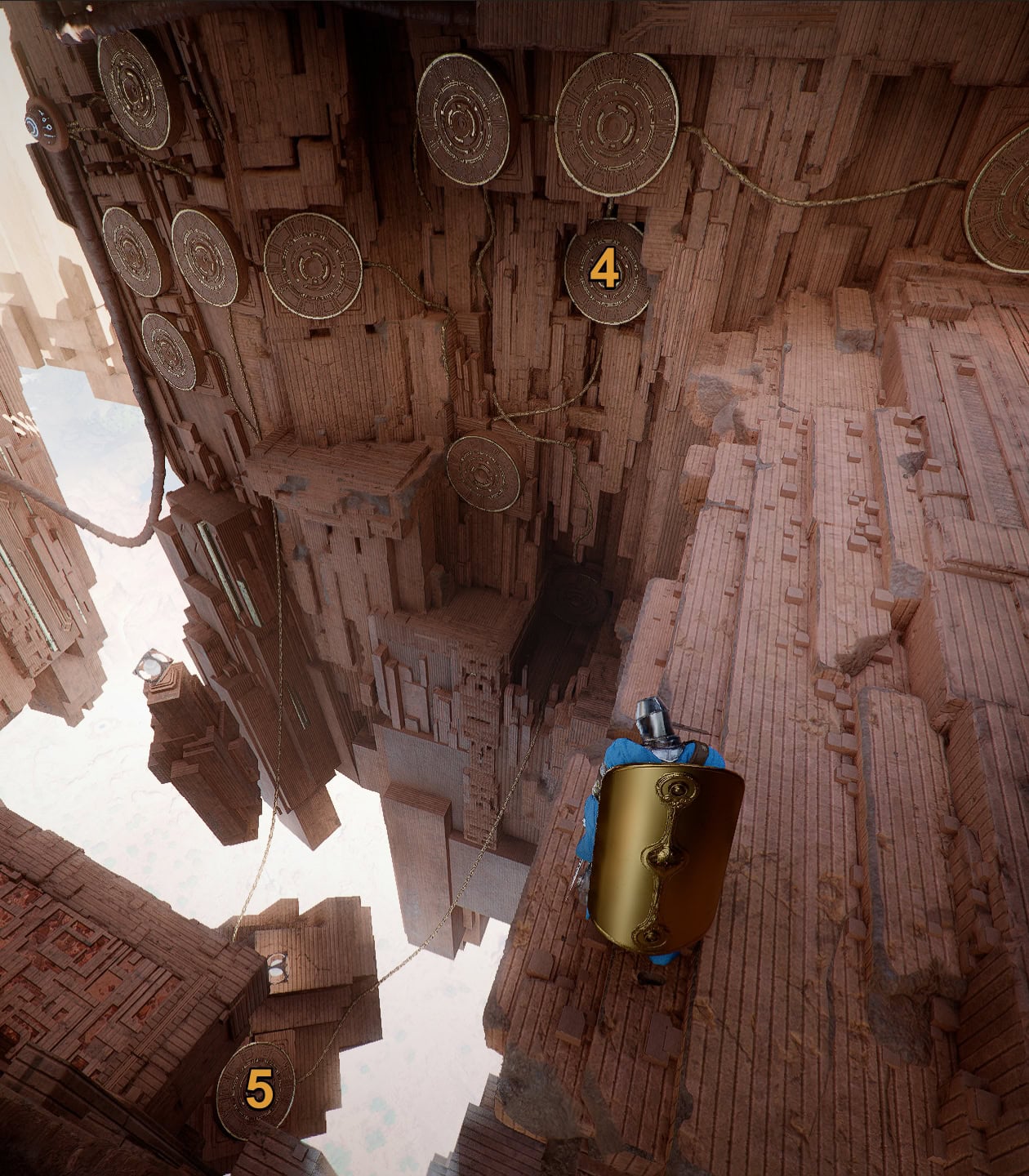 Lastly for the wall on the right, activate the recessed switch that’s higher up then activate the lone button on the floating platform below. This will activate the fan above and let you proceed to the Skybridge.