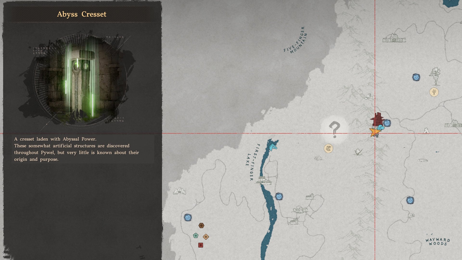 You can find an Abyss Cresset at the island in the middle of Silverwolf Lake, east of Silverwolf Mountain and north of Pailune City.
